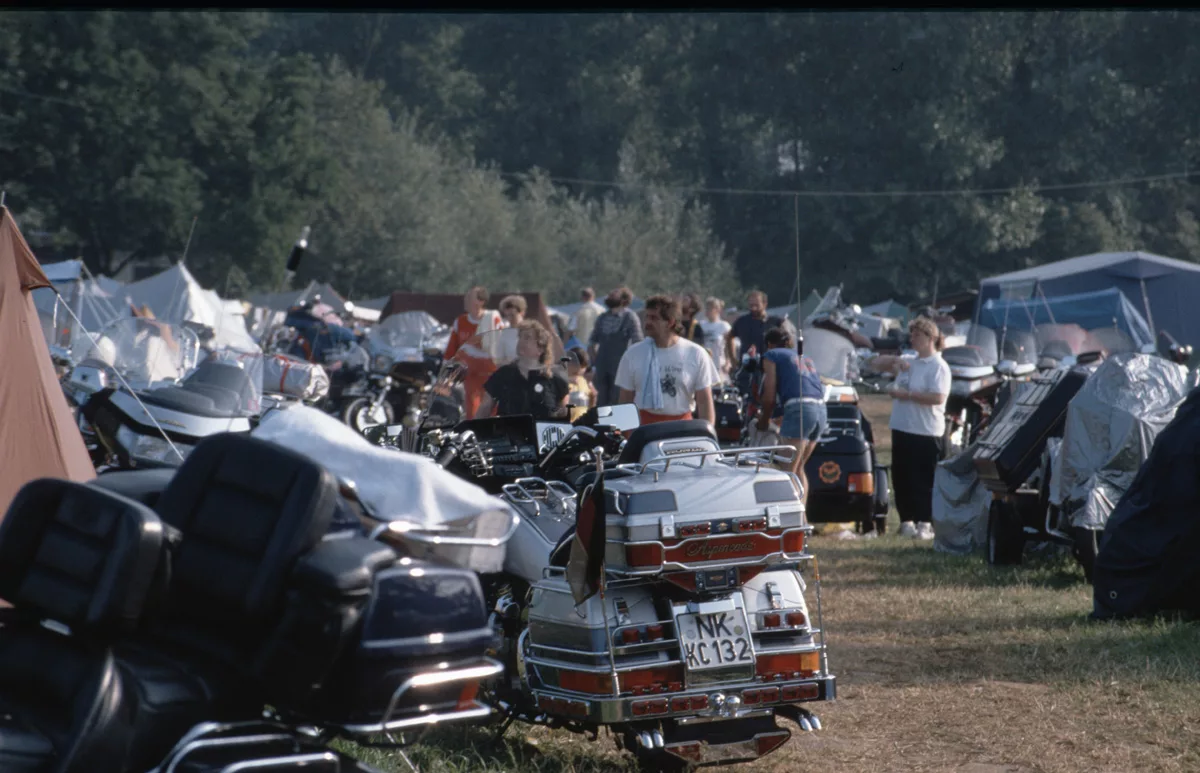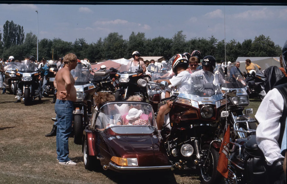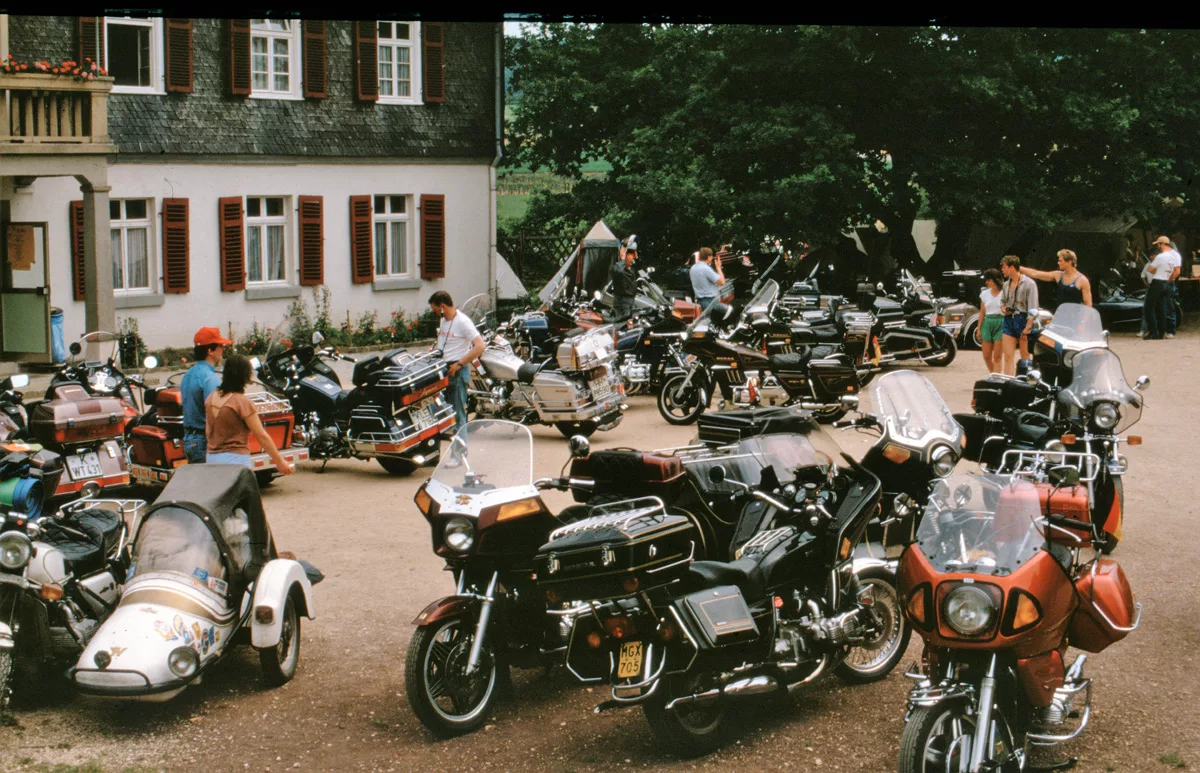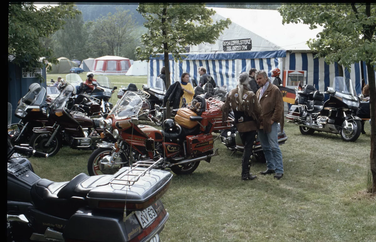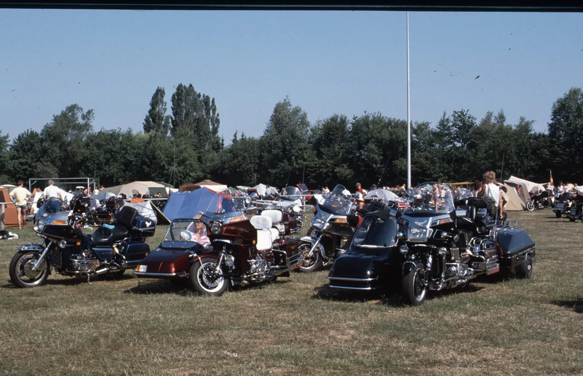 1978 entdeckten wir eine Anzeige im Syburger und in einer Motorradzeitung über ein Goldwing-Treffen, organisiert vom Freundeskreis der Goldwingfahrer. Unsere Neugier war geweckt – also packten wir unser Zelt aufs Motorrad und fuhren nach Heringen zum Café Mondschein zu unserem ersten Goldwing-Treffen. Dort trafen wir auf rund 100 weitere Goldwing-Fahrer und es entstanden die ersten Freundschaften.