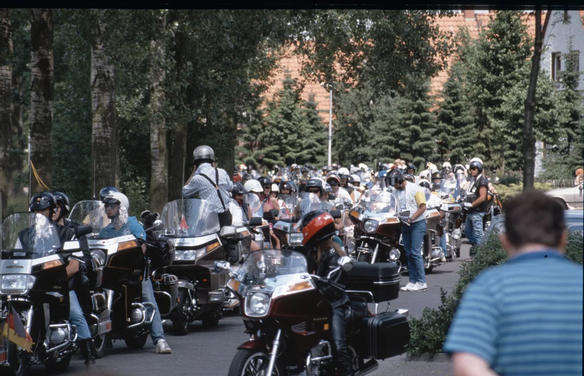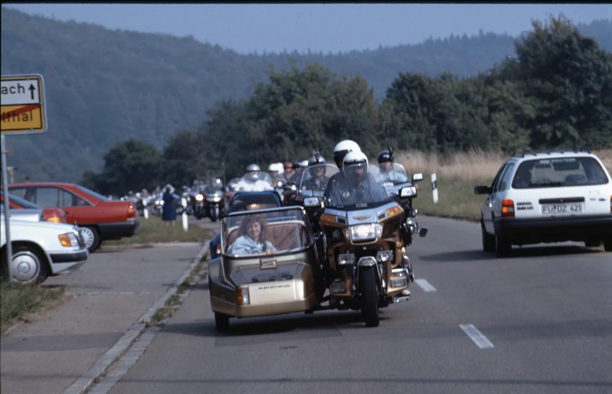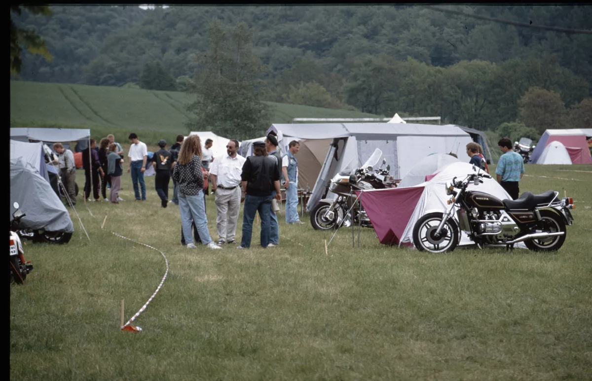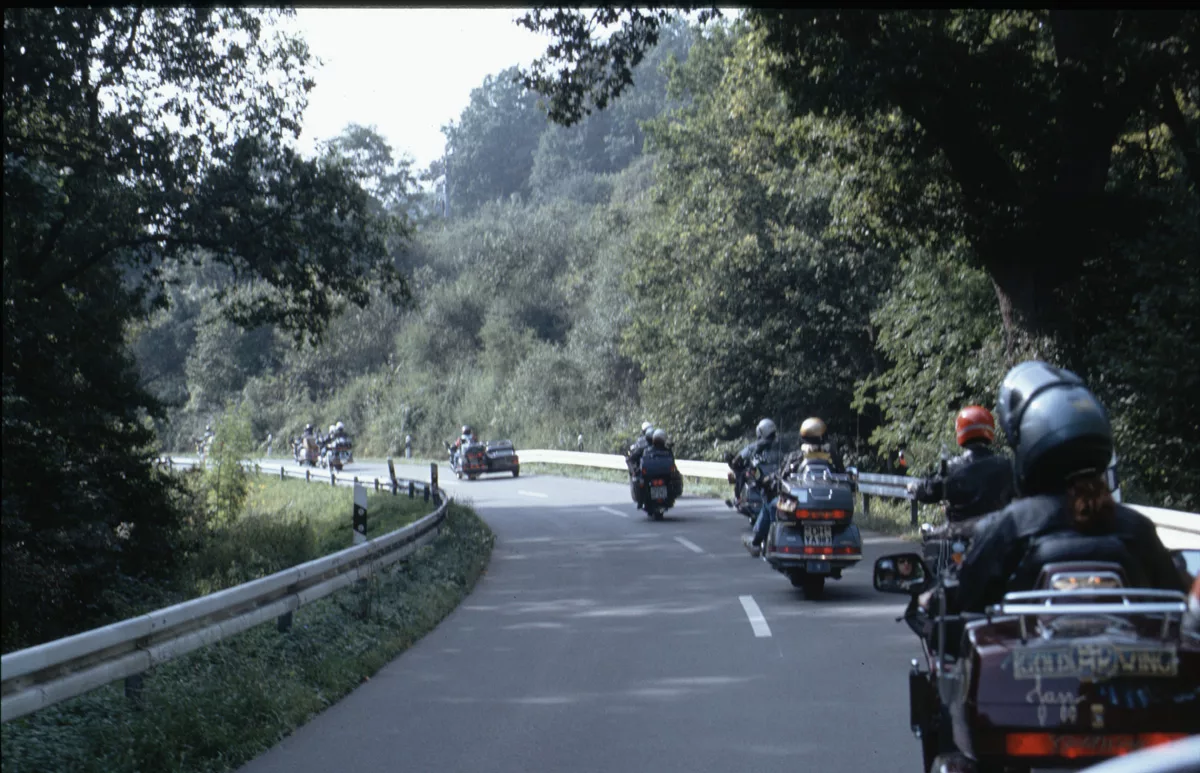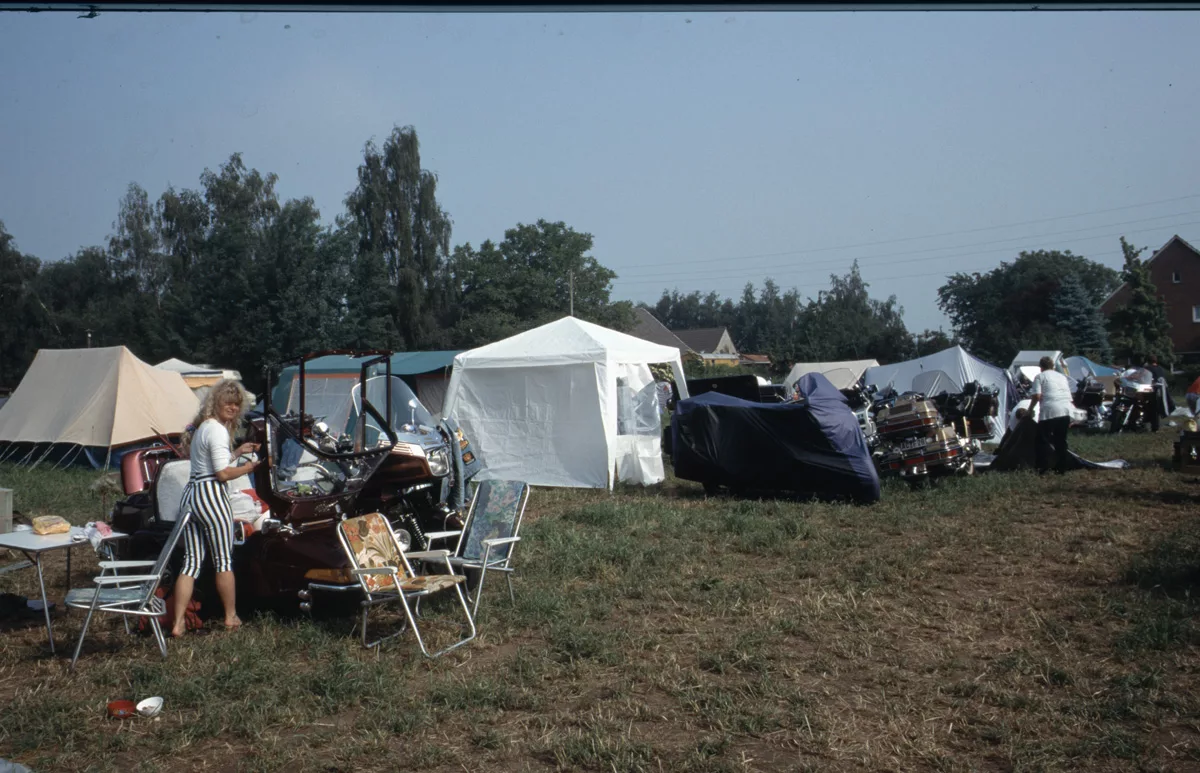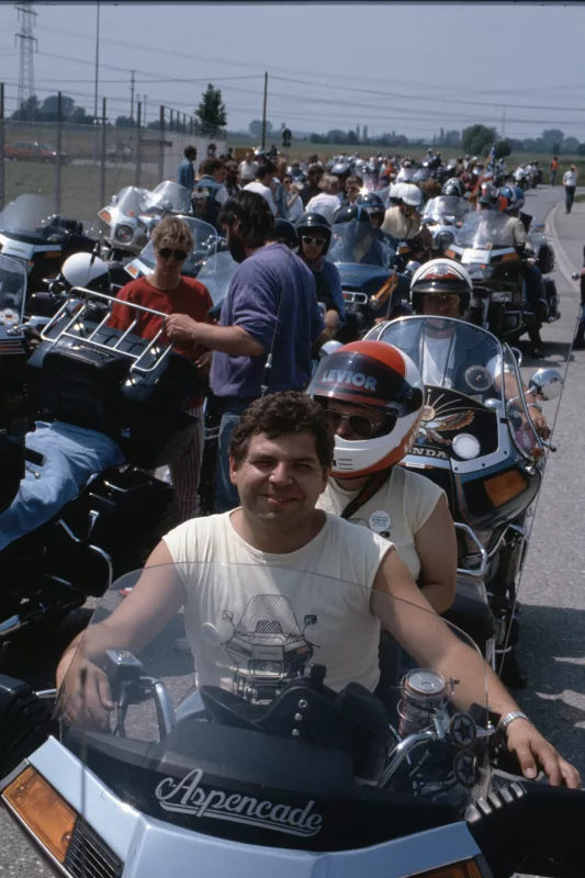 1978 entdeckten wir eine Anzeige im Syburger und in einer Motorradzeitung über ein Goldwing-Treffen, organisiert vom Freundeskreis der Goldwingfahrer. Unsere Neugier war geweckt – also packten wir unser Zelt aufs Motorrad und fuhren nach Heringen zum Café Mondschein zu unserem ersten Goldwing-Treffen. Dort trafen wir auf rund 100 weitere Goldwing-Fahrer und es entstanden die ersten Freundschaften.