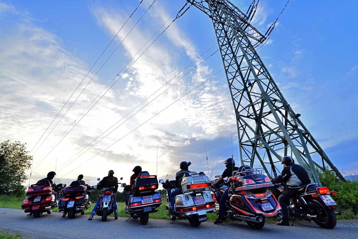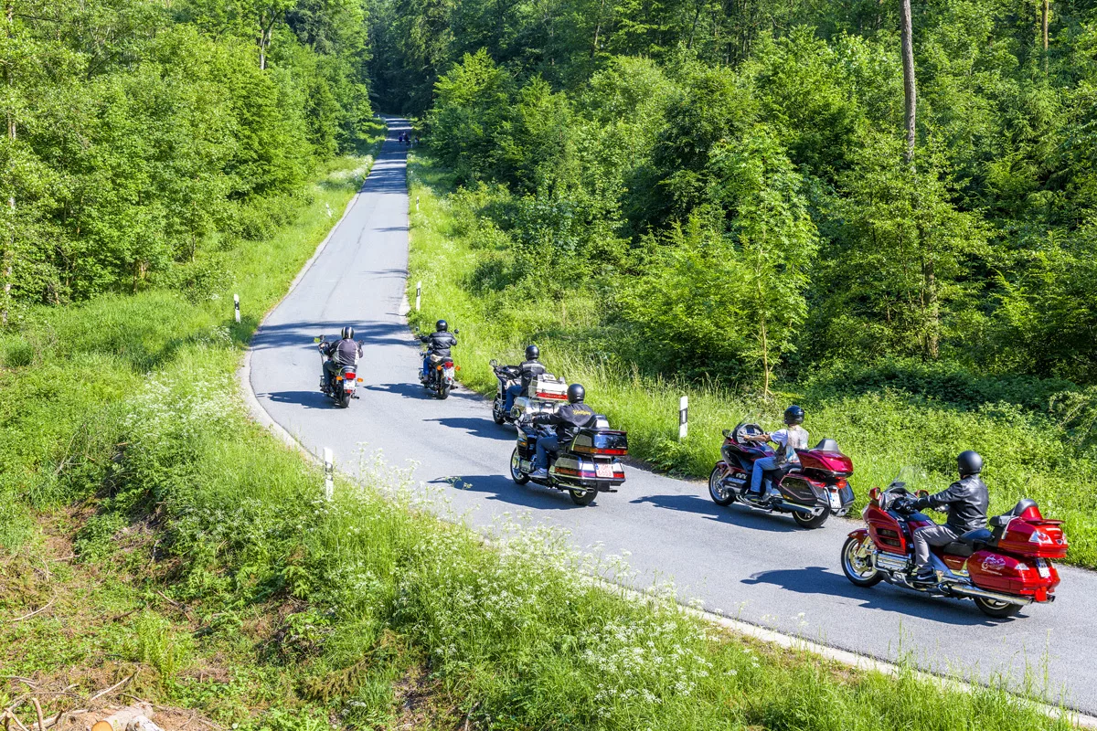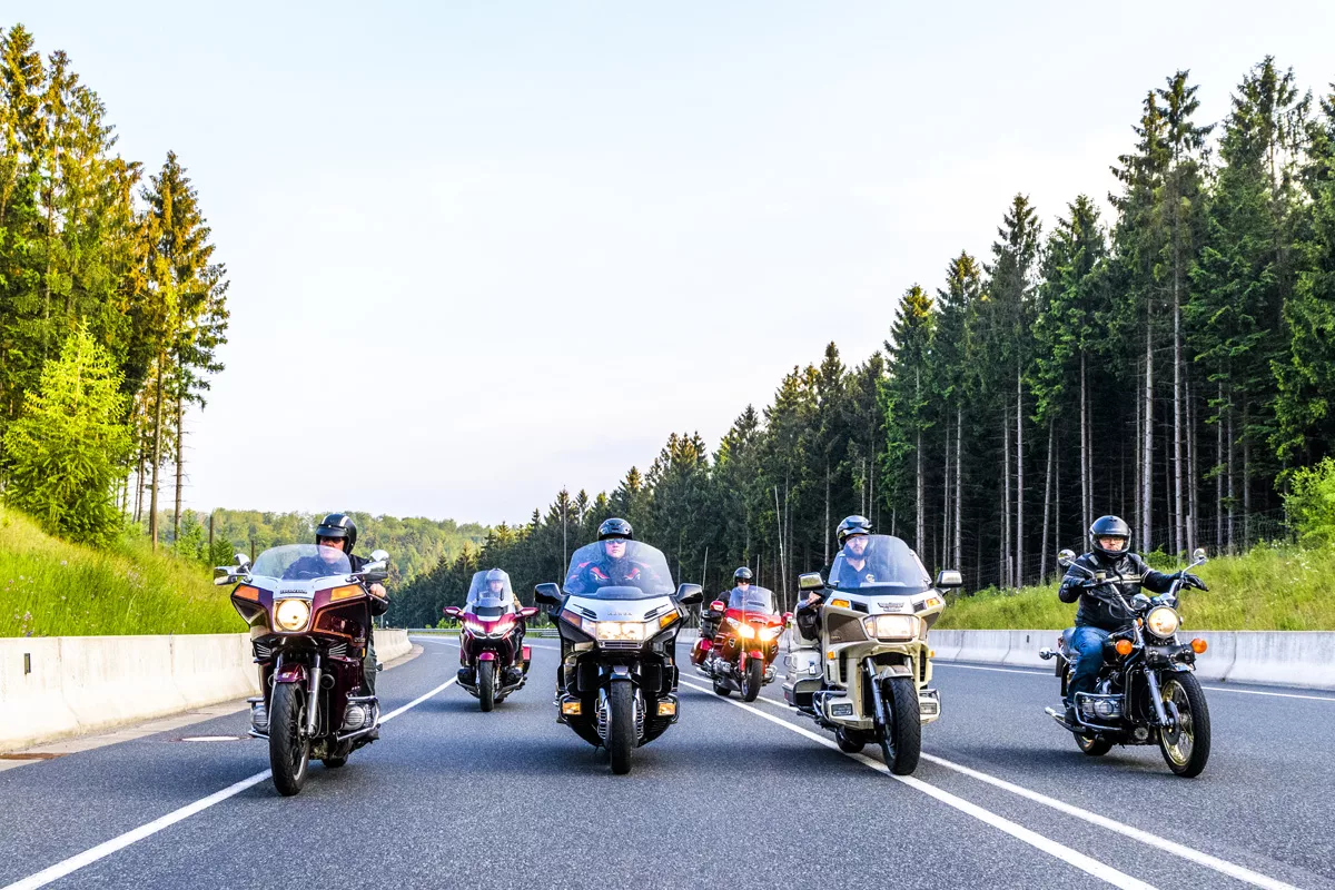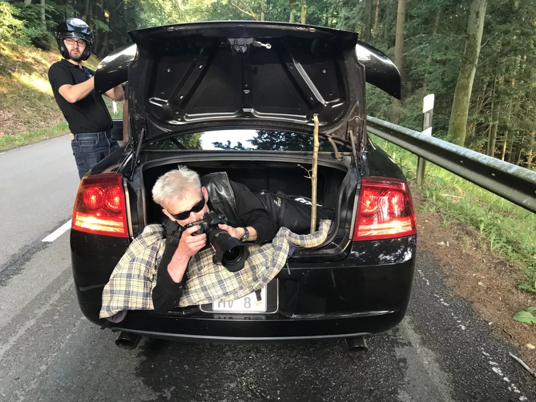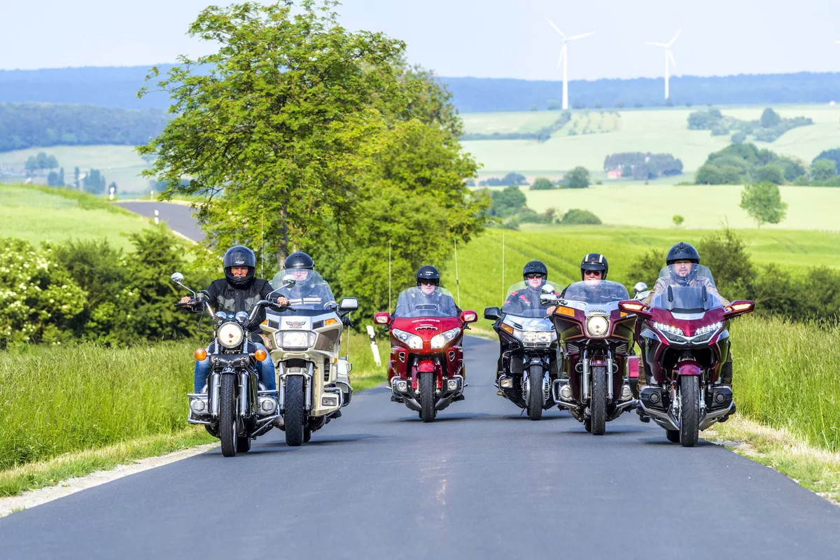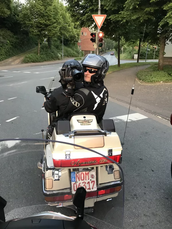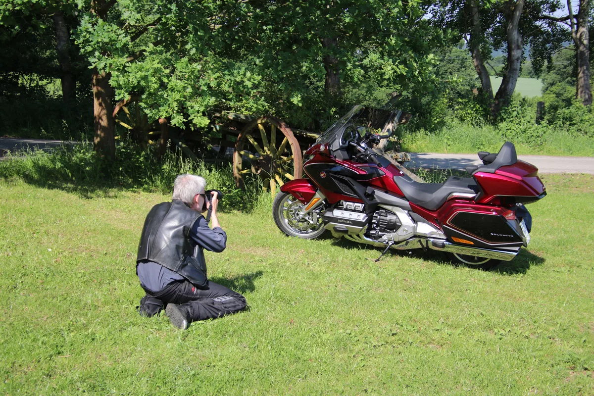 Nach der Stärkung begann die Fotosession mit Profifotograf Klaus Daams. Auf öffentlichen Straßen, ohne Absperrungen, entstanden beeindruckende Bilder – teils mit Gegenverkehr und Millimeterarbeit auf der Bundesstraße. Besonders herausfordernd: Das Bild „Elefantentreffen“ (Seite 57), bei dem sechs Gold Wings perfekt positioniert werden mussten. Klaus Daams lag dabei im Kofferraum, um das perfekte Foto zu schießen!
