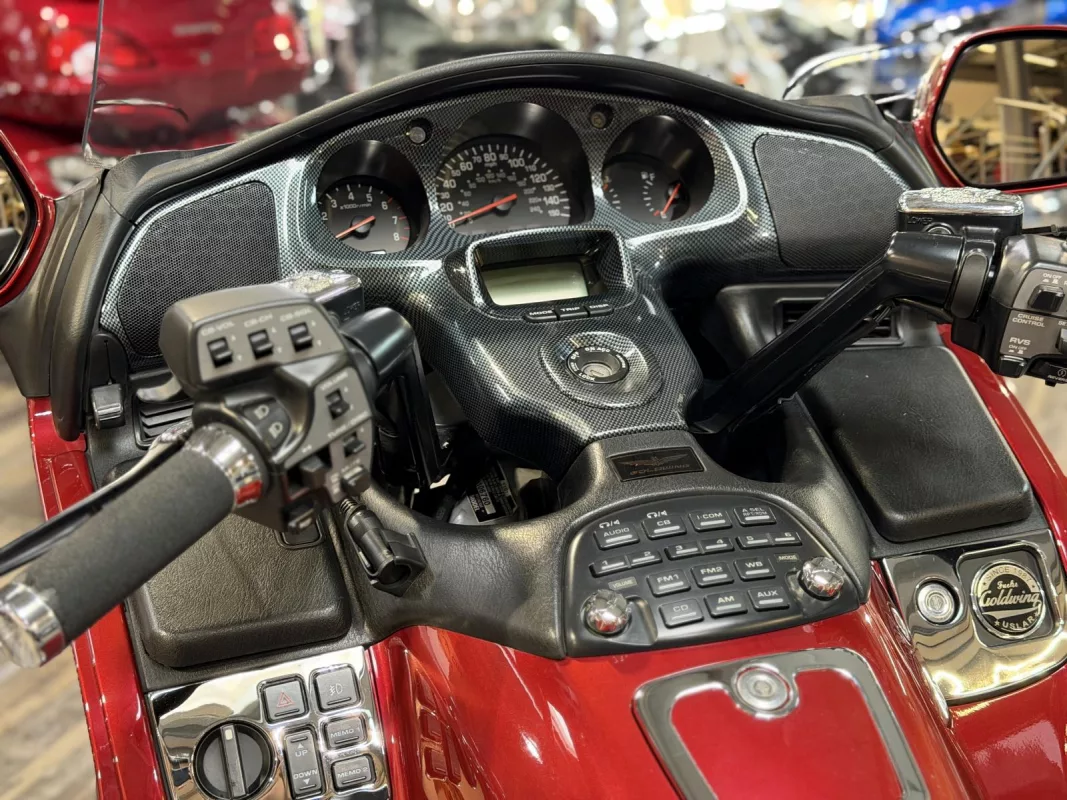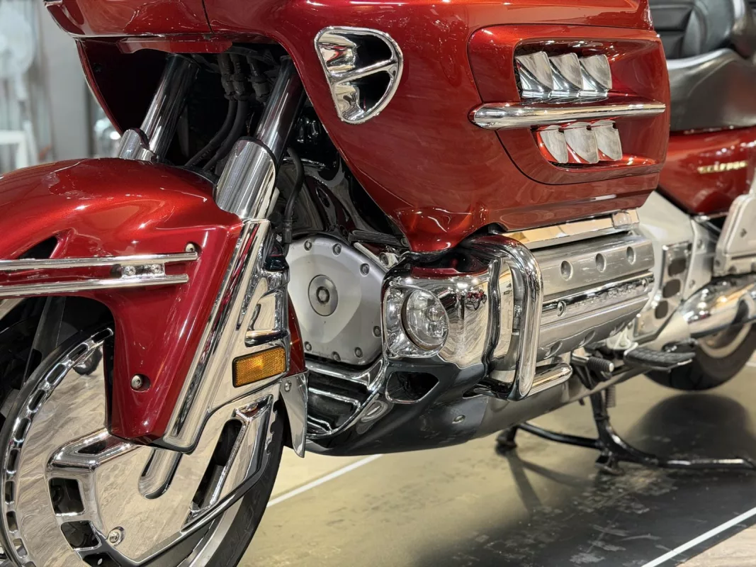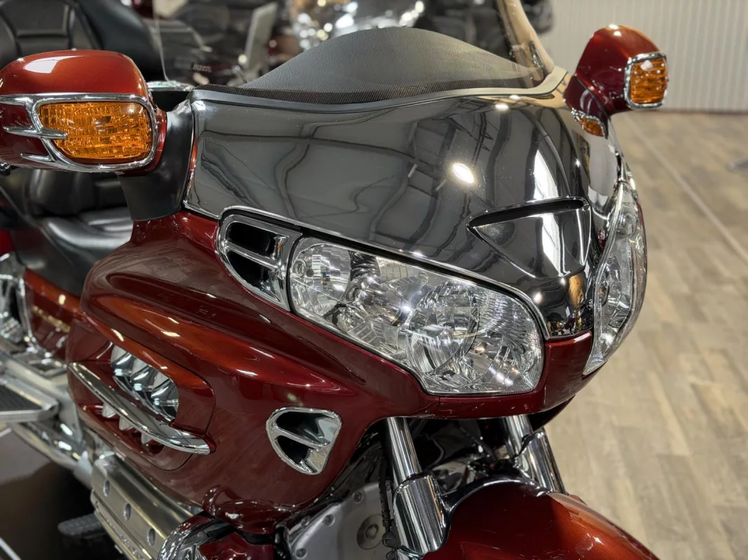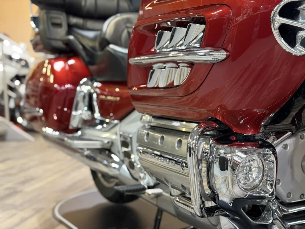 Diese GL 1800 präsentiert sich in einem exzellenten Zustand und besticht durch zahlreiche optische Highlights: Zierstreifen an Topcase und Koffern, verchromte Bremsscheibenabdeckungen, Bugspoiler in Chrom, Nebelscheinwerfer (Fog Lights) sowie ein Dashboard in edler Carbon-Optik.