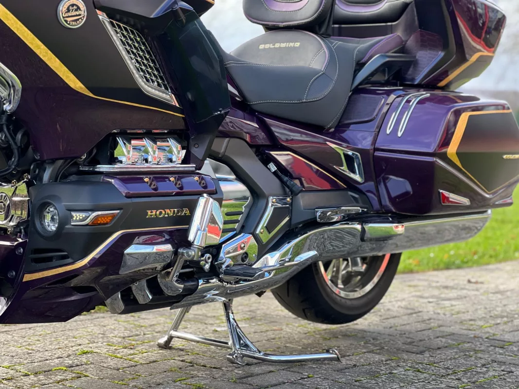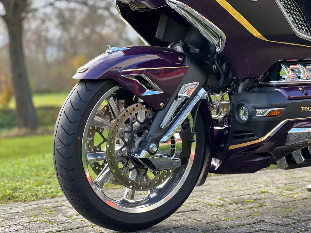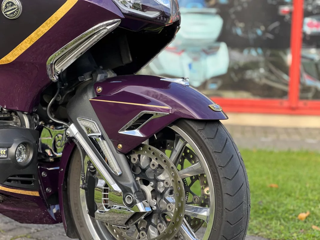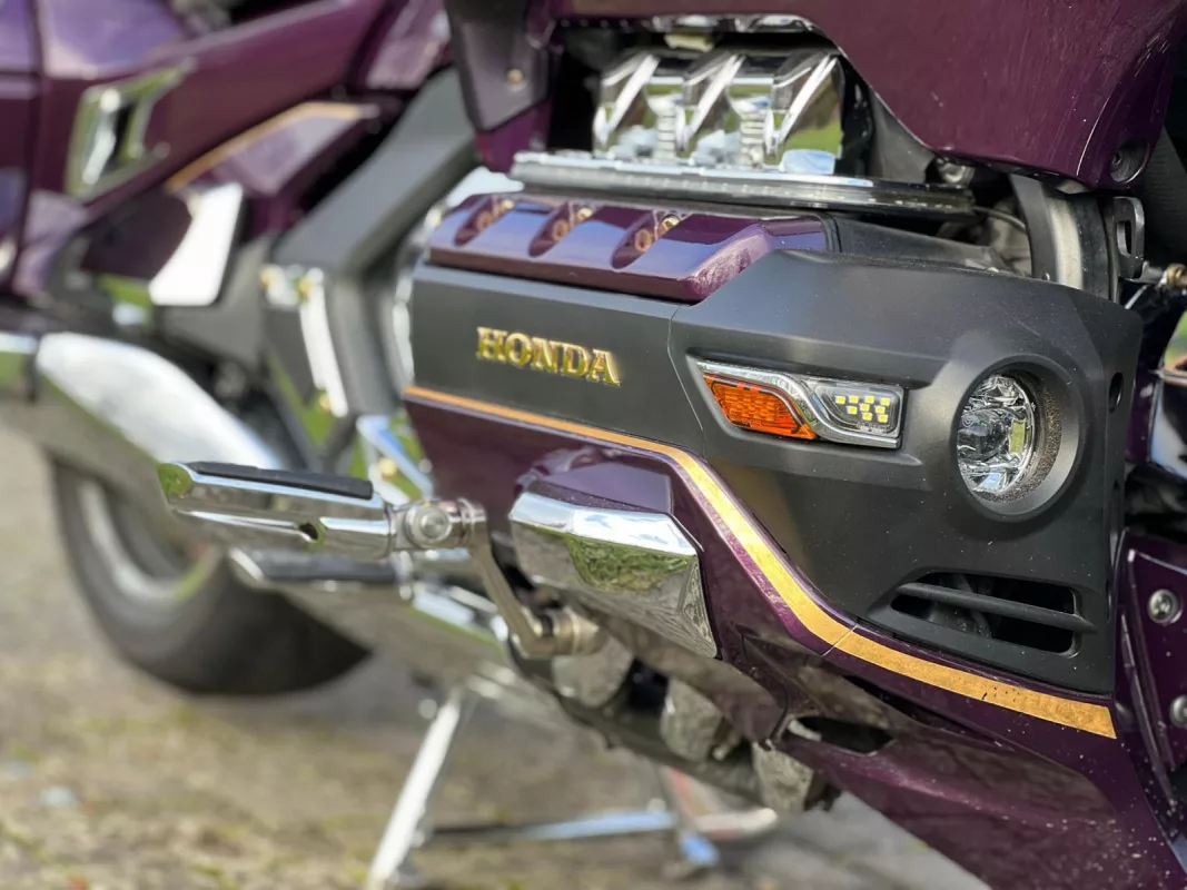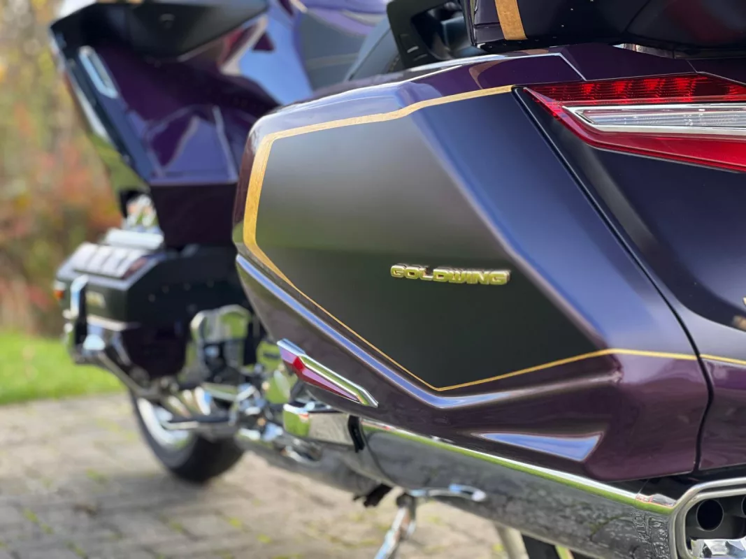 Die besondere Lackierung in Magenta (historische Farbe aus der GL1500 Baureihe), abgesetzt mit matten Feldern und Blattgoldverzierungen machen diese Wing zum absoluten Unikat.