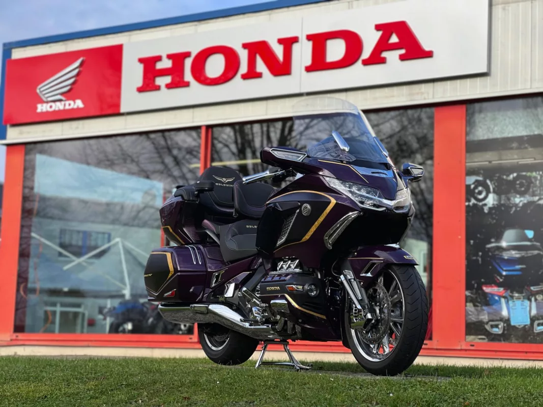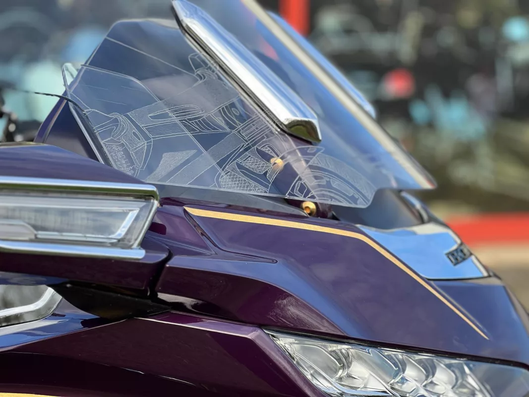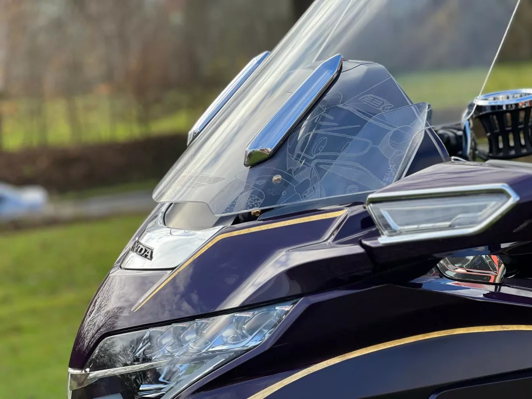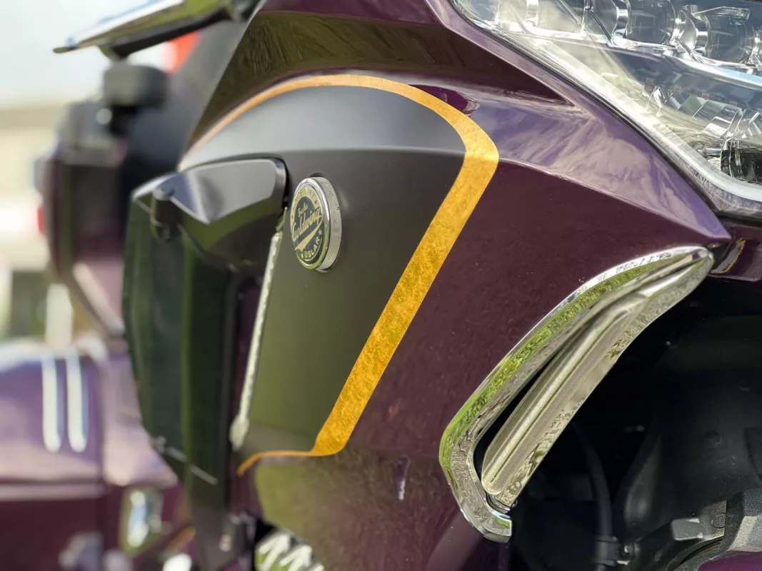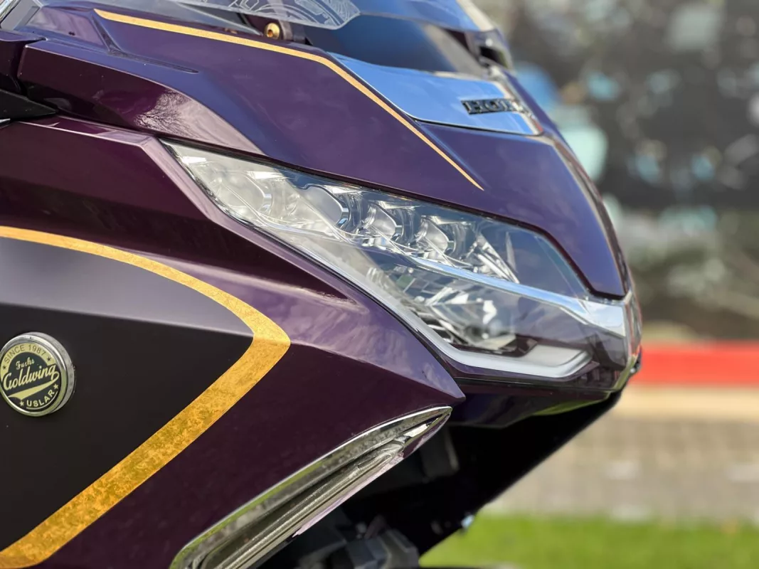 Die besondere Lackierung in Magenta (historische Farbe aus der GL1500 Baureihe), abgesetzt mit matten Feldern und Blattgoldverzierungen machen diese Wing zum absoluten Unikat.