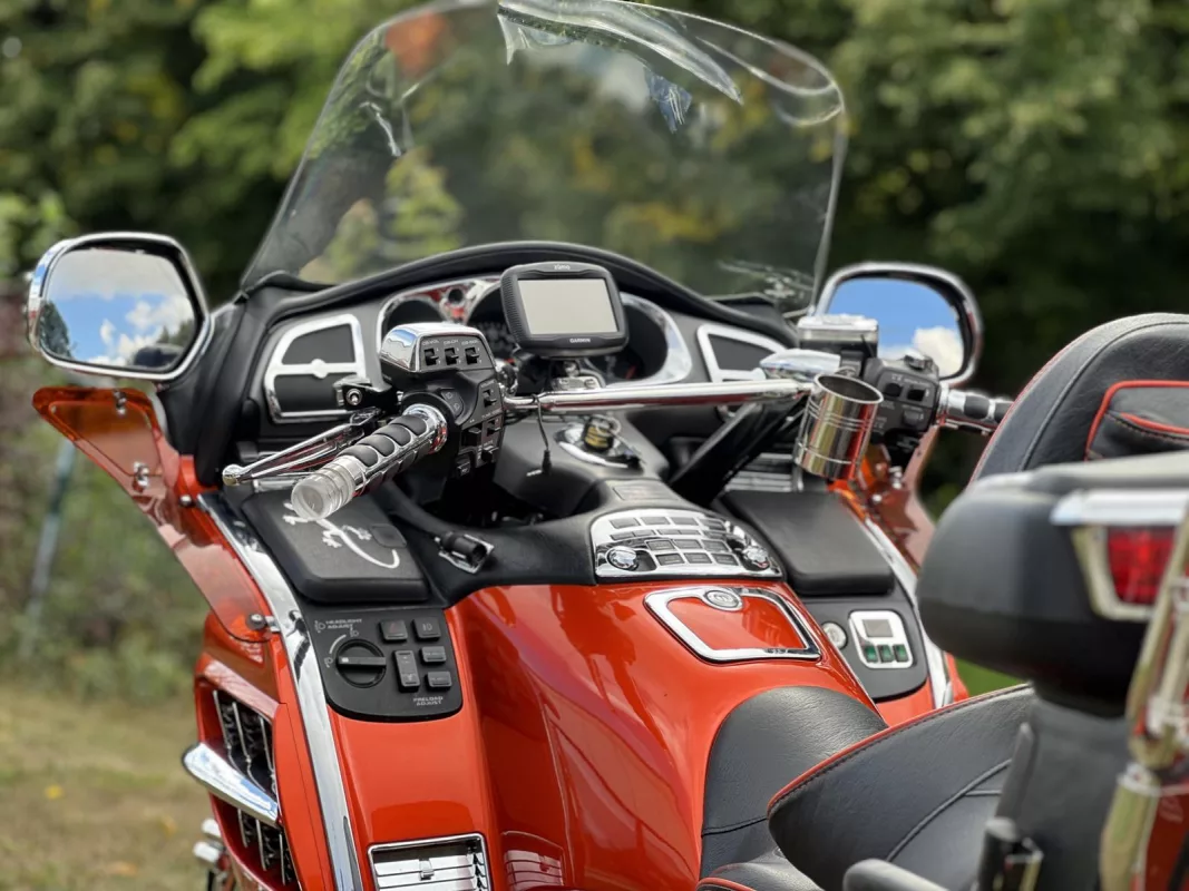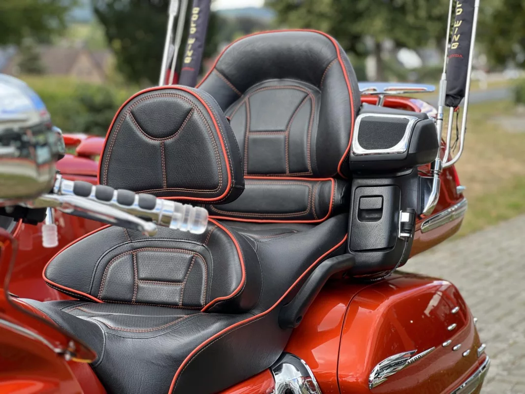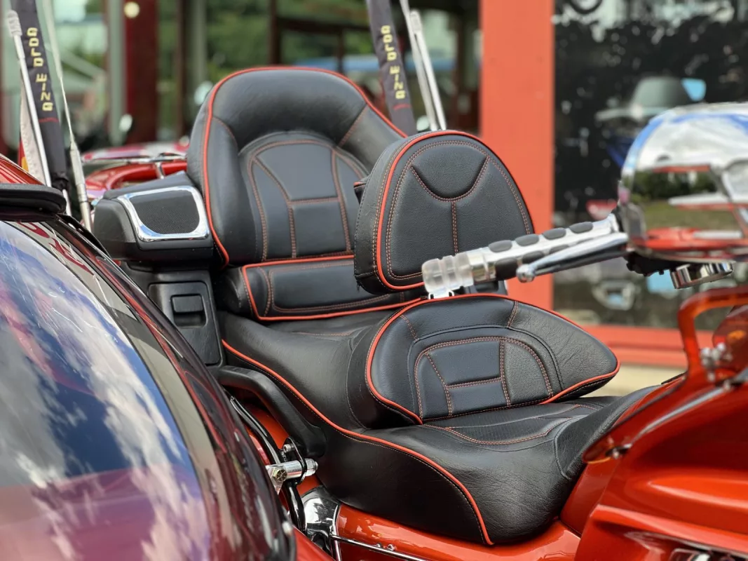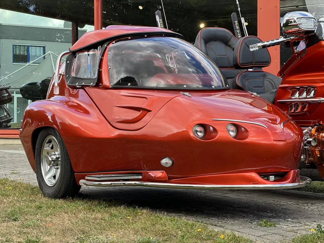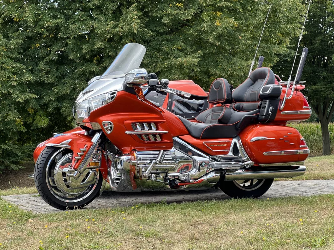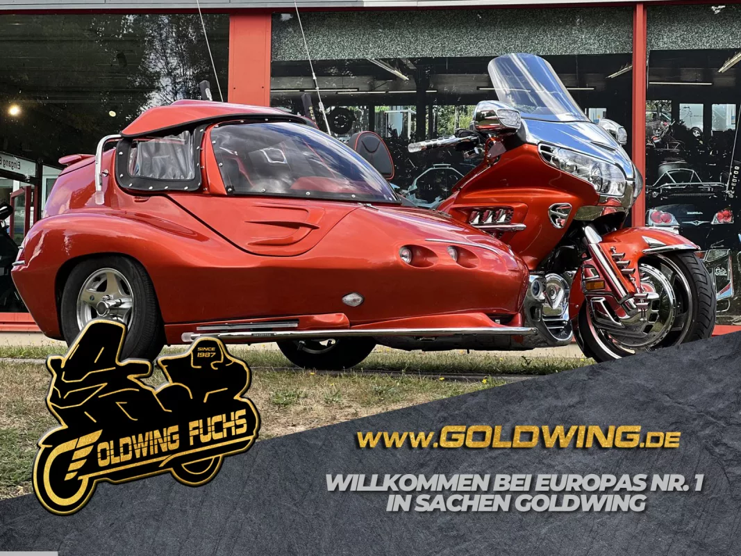 Tolles GL 1800 Hannigan Gespann in Juniper Orange ! Super Fahrgefühl durch Easy-Steer Gabelumbau... Der Seitenwagen lässt sich während der Fahrt absenken bzw. anheben und garantiert dadurch immer optimalen Geradeauslauf.