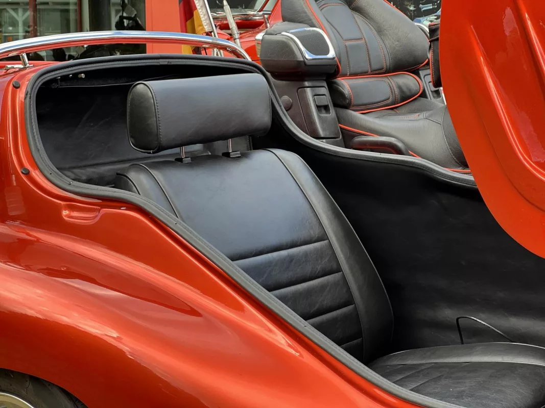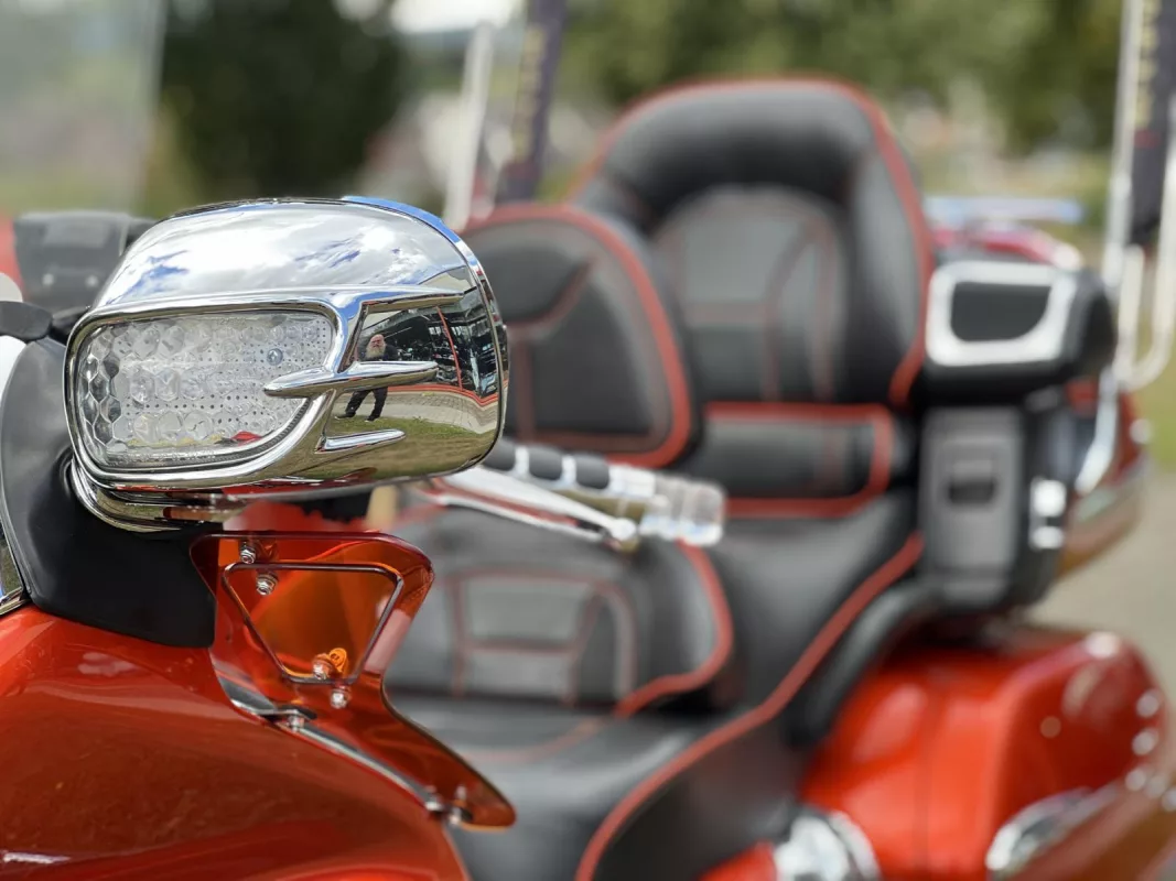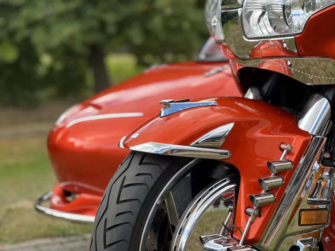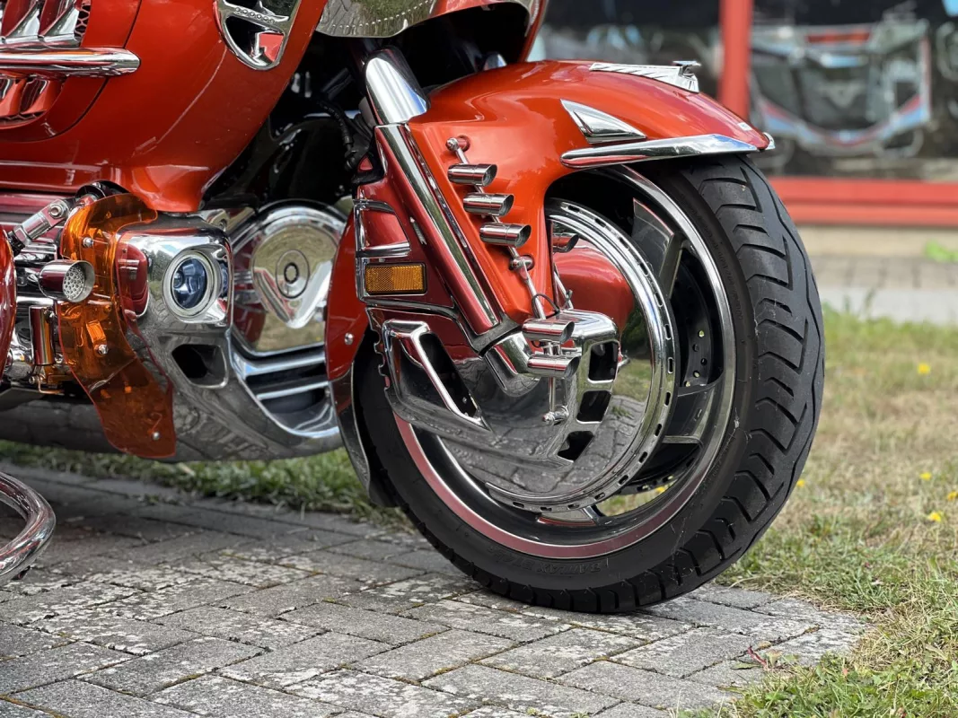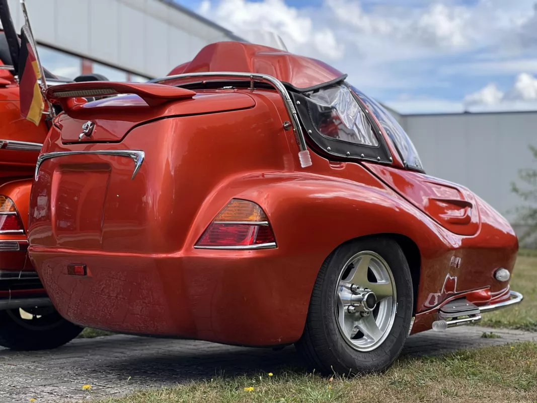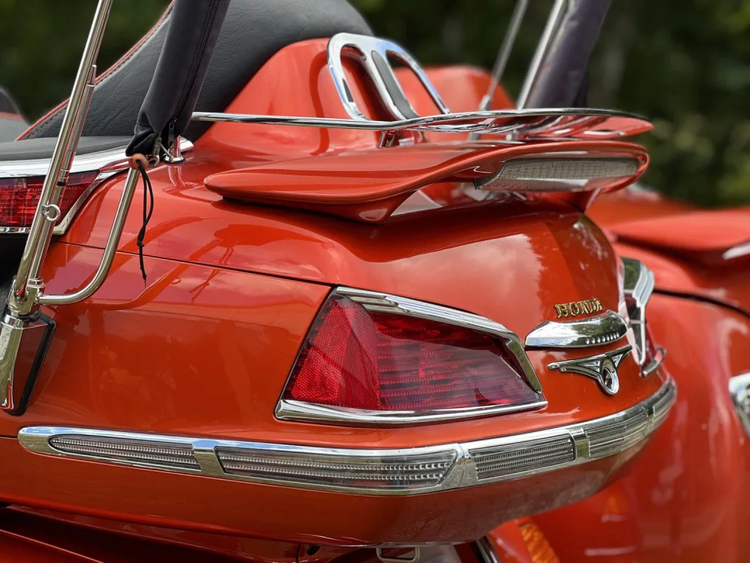 Tolles GL 1800 Hannigan Gespann in Juniper Orange ! Super Fahrgefühl durch Easy-Steer Gabelumbau... Der Seitenwagen lässt sich während der Fahrt absenken bzw. anheben und garantiert dadurch immer optimalen Geradeauslauf.