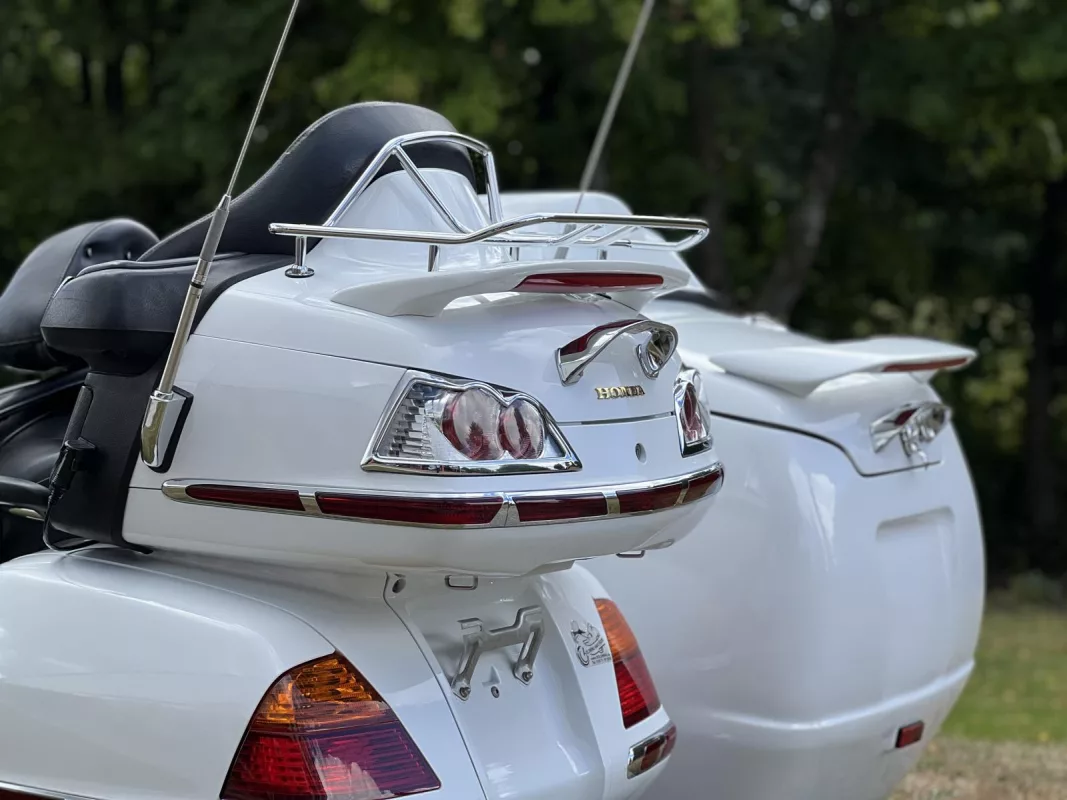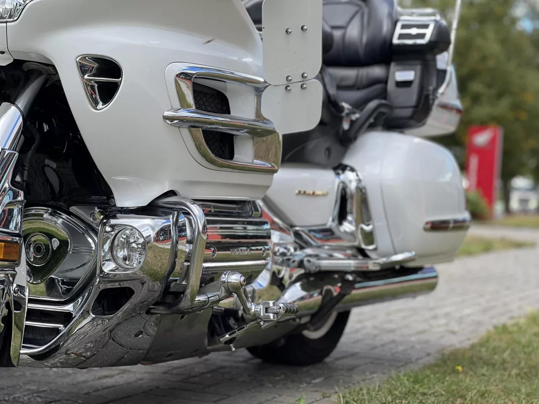 Super schick aufgebaut! Mit in weiss gepulverten Felgen, Rotor Covers, Kühler Chromrahmen, Shark Grill Fairing, Air Wings, komplettes Motor und Rahmen Chrompaket, Fog Lights, Rail Slider Grips, Fahrerlehne, Beifahrertrittschutz, Gepäckträger, beide Spoiler, HW Pegs, TC und Kofferchromstreifen, CB Antenne, Tank Pads, Chrompaket Innenverkleidung, Dashtop in Fahrzeugfarbe and many more...