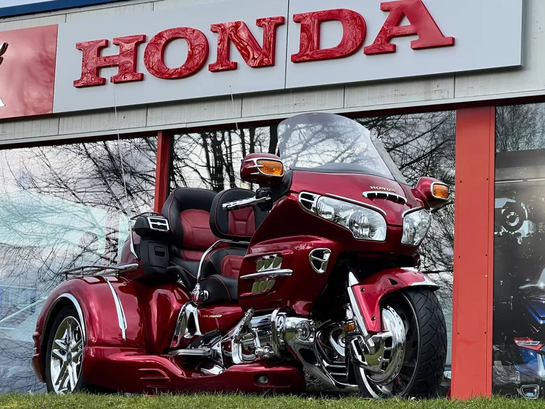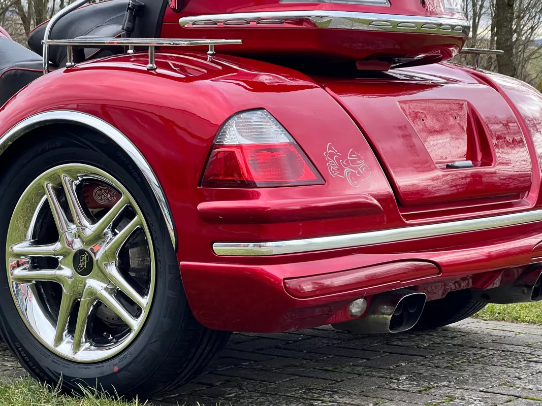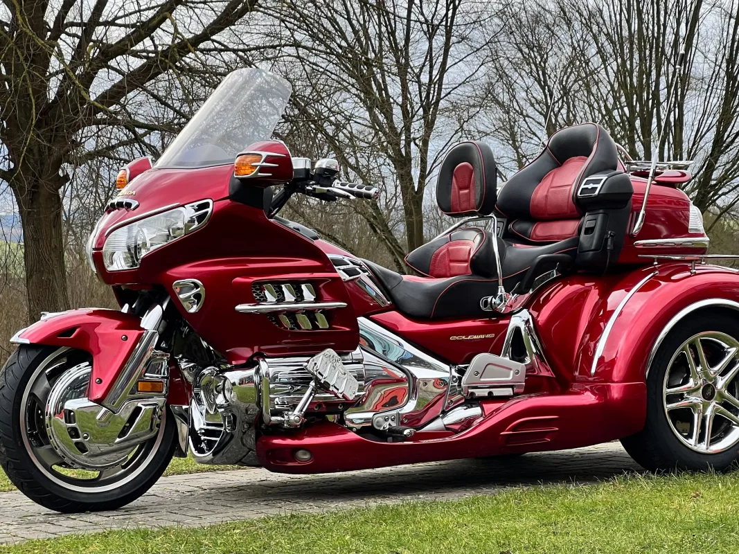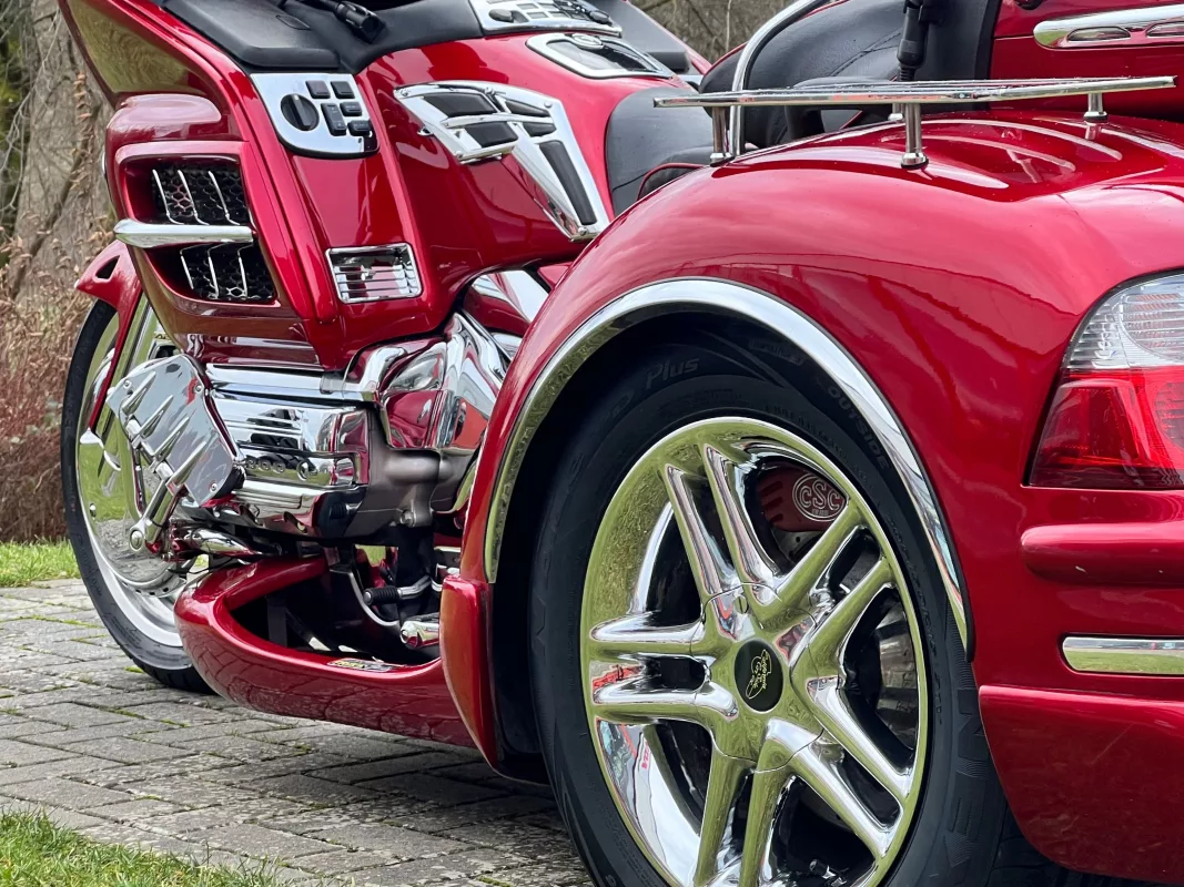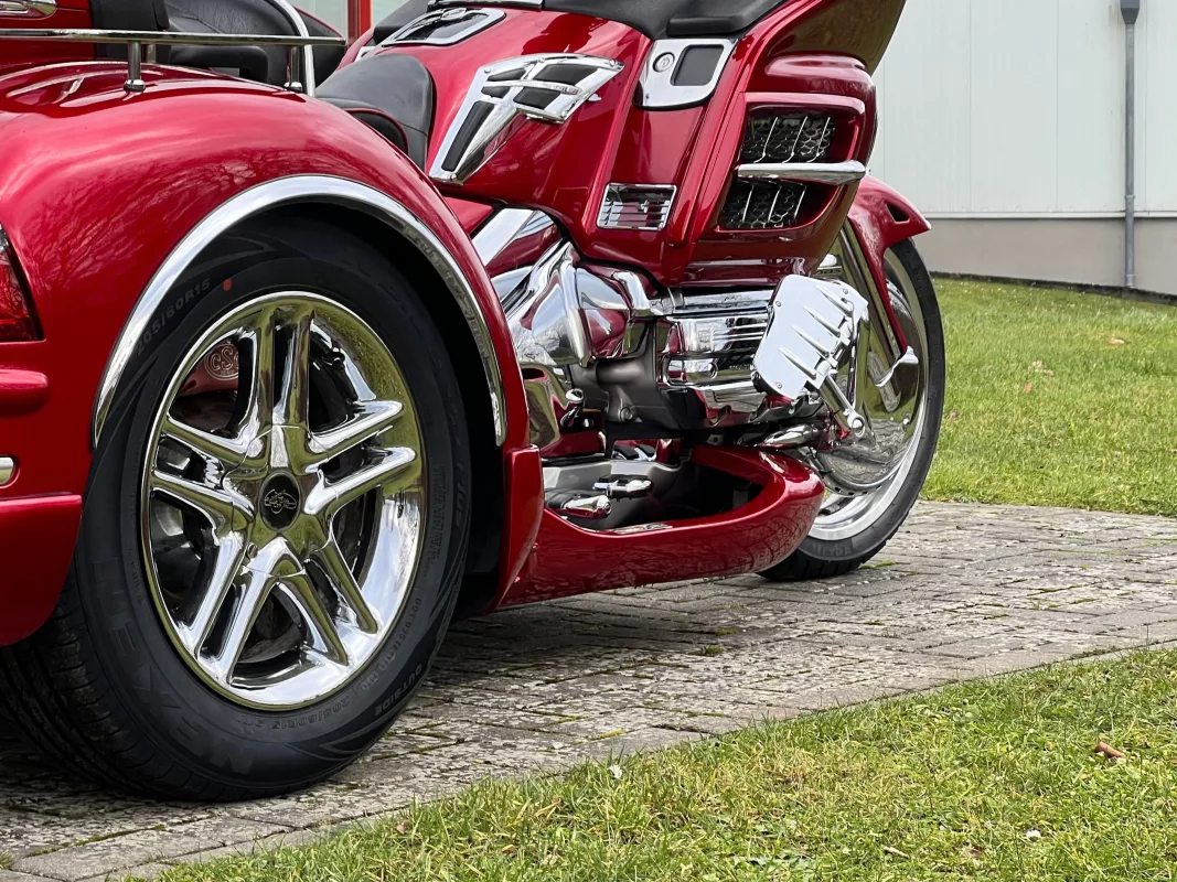 GL 1800 Cobra Trike in Candy Red. Fulldresser vom feinsten. Rotor Covers, verchromter Bugspoiler, Fog Lights, HW Boards, komplettes Motor und Rahmen Chrompaket, 2 tone Stzbank mit Fahrerlehne, Speere auf den Kotflügeln, alle 3 Gepäckträger, CB Antenne, TC Spoiler, Shark Grills, Eye Brows, Spiegel Chromrahmen, Tank Pads, Dashtop in Fahrzeugfarbe and many, many more...