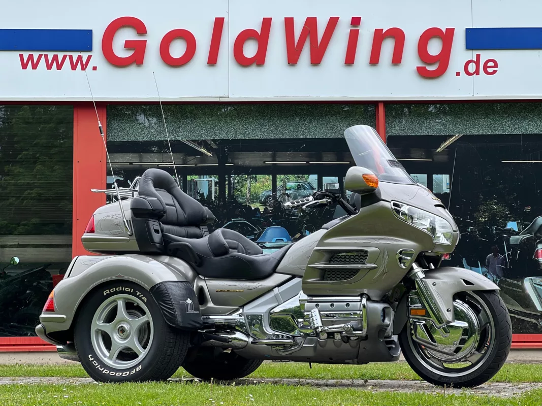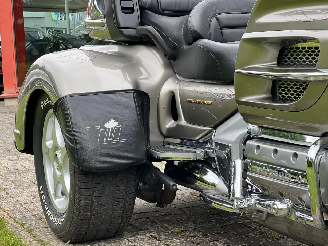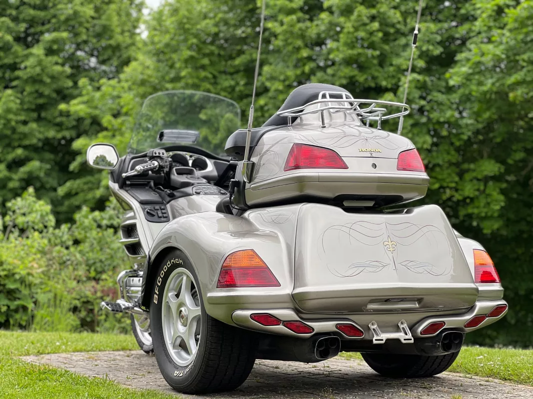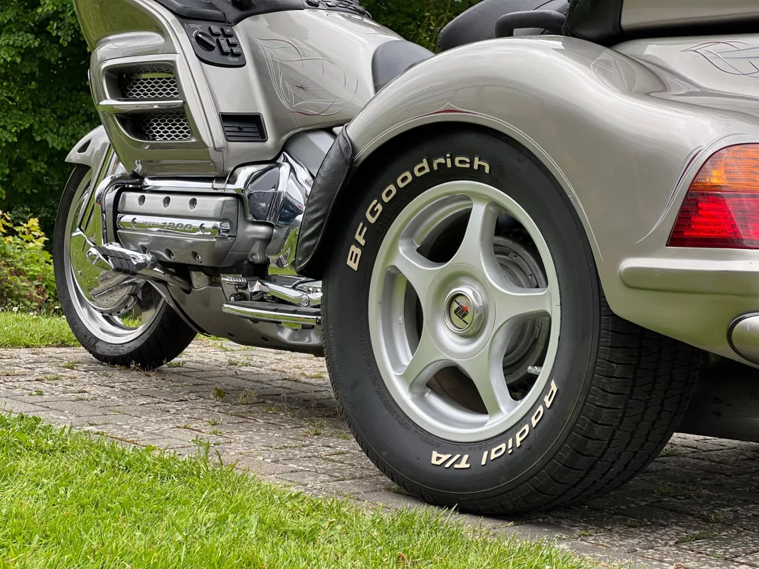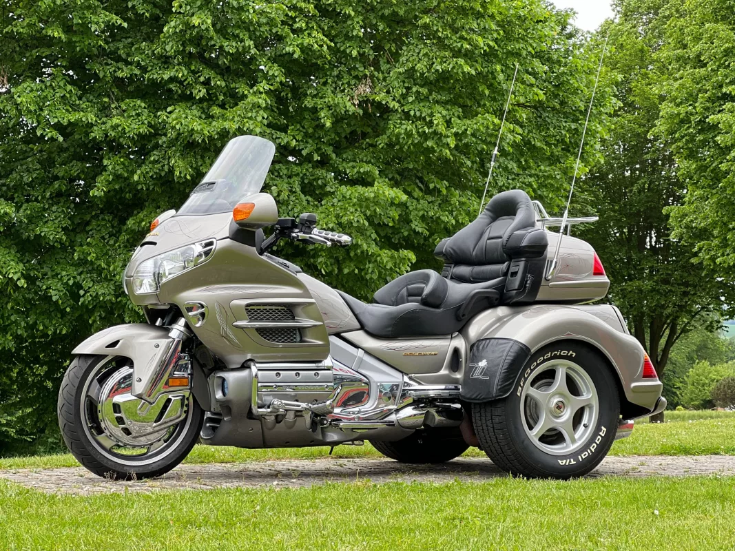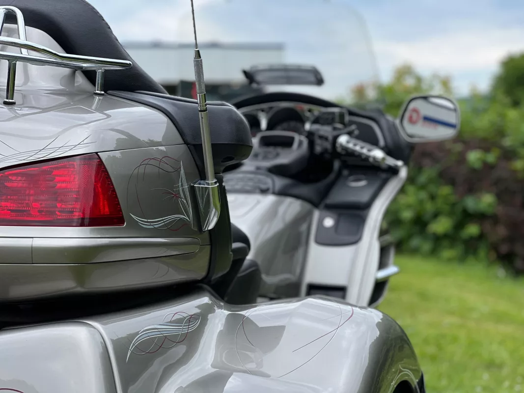 GL1800 Lehman Trike Typ Monarch 3 in Stream Silver Metallic. Mega seltener Umbau. Sehr schön veredelt mit Rotor Covers, Fog Lights, Pig Nose Covers, HW Pegs, Trittbrettanlage, Pivot Covers, tolles Pinstriping, Gepäckträger, CB Antenne, Küry Akyn Style Light Bar, Iso Grips. K+B Hebel and some more..