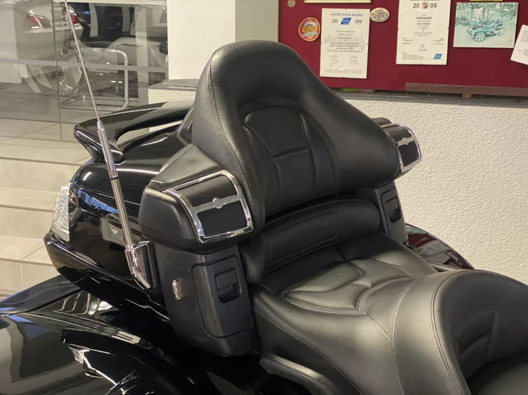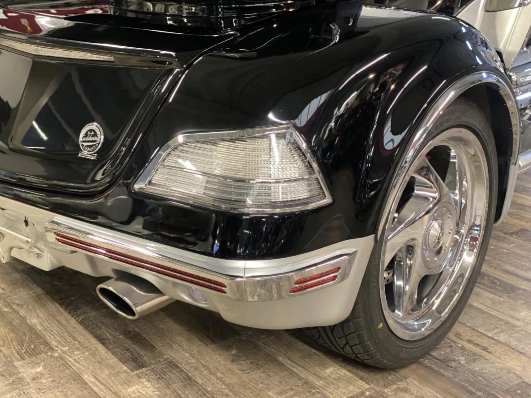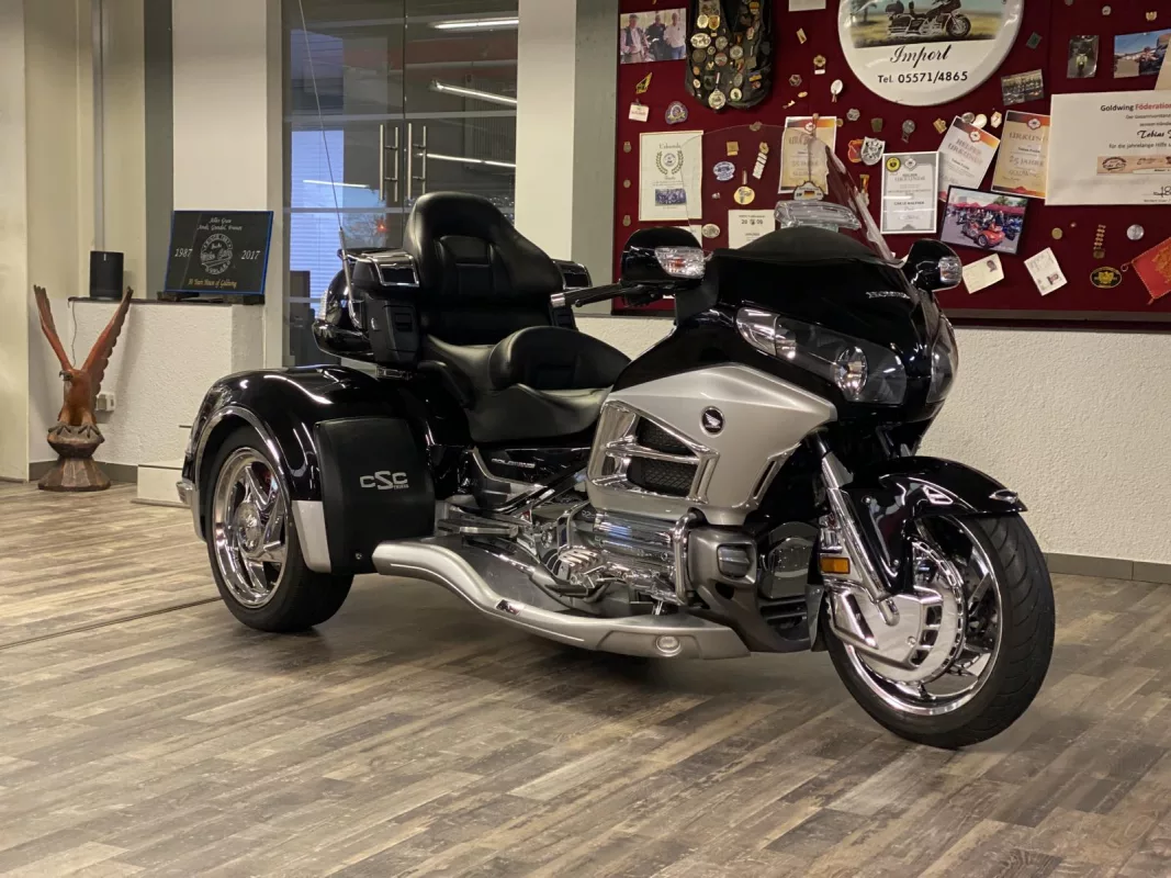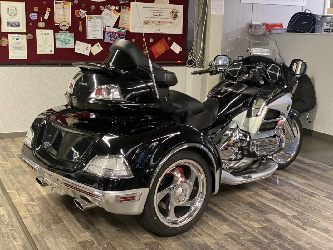 GL1800 Viper Trike der Superlative in "Gloss Black ". Der Trike Umbau ist NEU ! Verdichtete Felge vorne, Rotor Covers, Kotflügelverlängerung, weiße Blinker, Kühlerchromrahmen, komplettes Motor und Rahmen Chrompaket, TC Spoiler oben, HW Boards, Chrom Paket Innenverkleidung and some more...