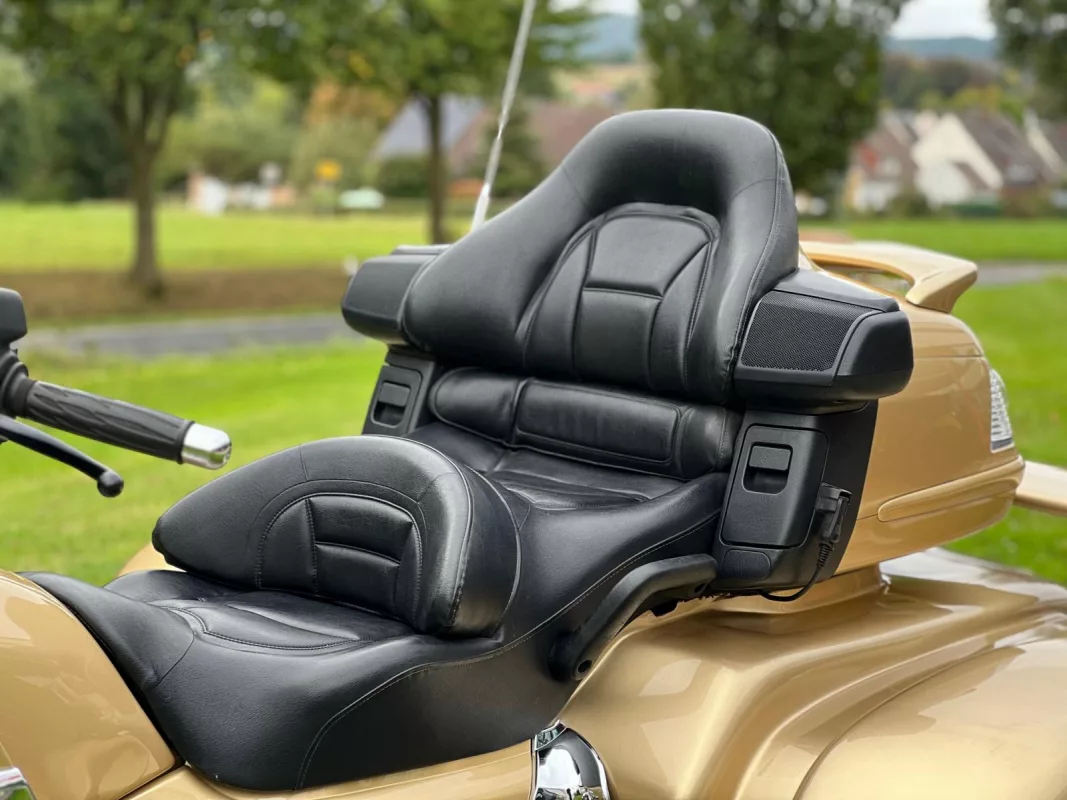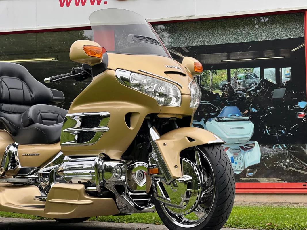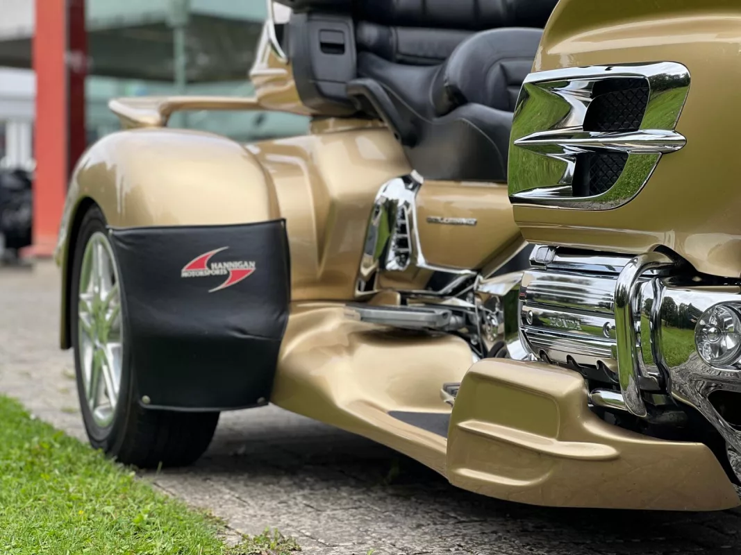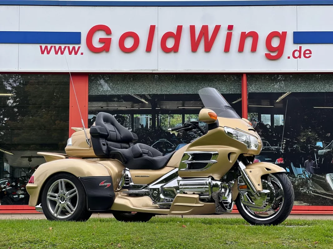 Der Hammer ! GL 1800 Hannigan Trike in Topeka Gold. Traumhafte Optik gepaart mit erstklassiger Technik und Einzelradaufhängung. Sehr stilvoll veredelt mit Eye Brows, Kühlerchromrahmen, Fog Lights, verchromter Bugspoiler, Rotor Covers, komplettes Motor und Rahmen Chrom Paket, Beifahrertrittschutz, beide Spoiler, Trittbrettanlage, Chrom Paket Innen Verkleidung and some more...