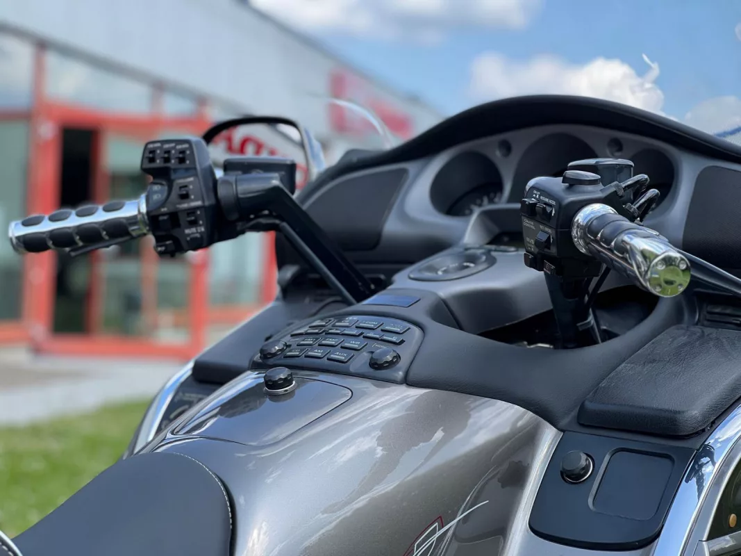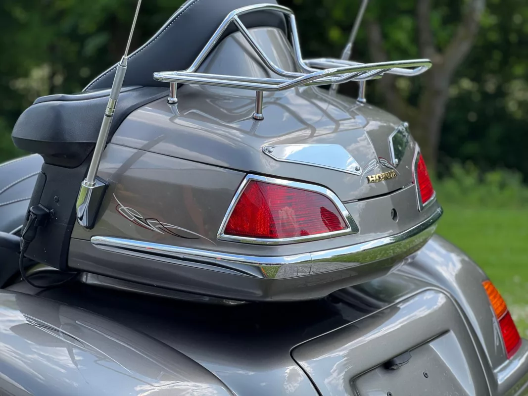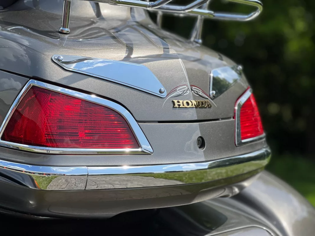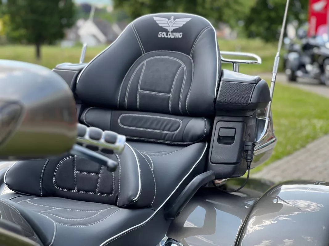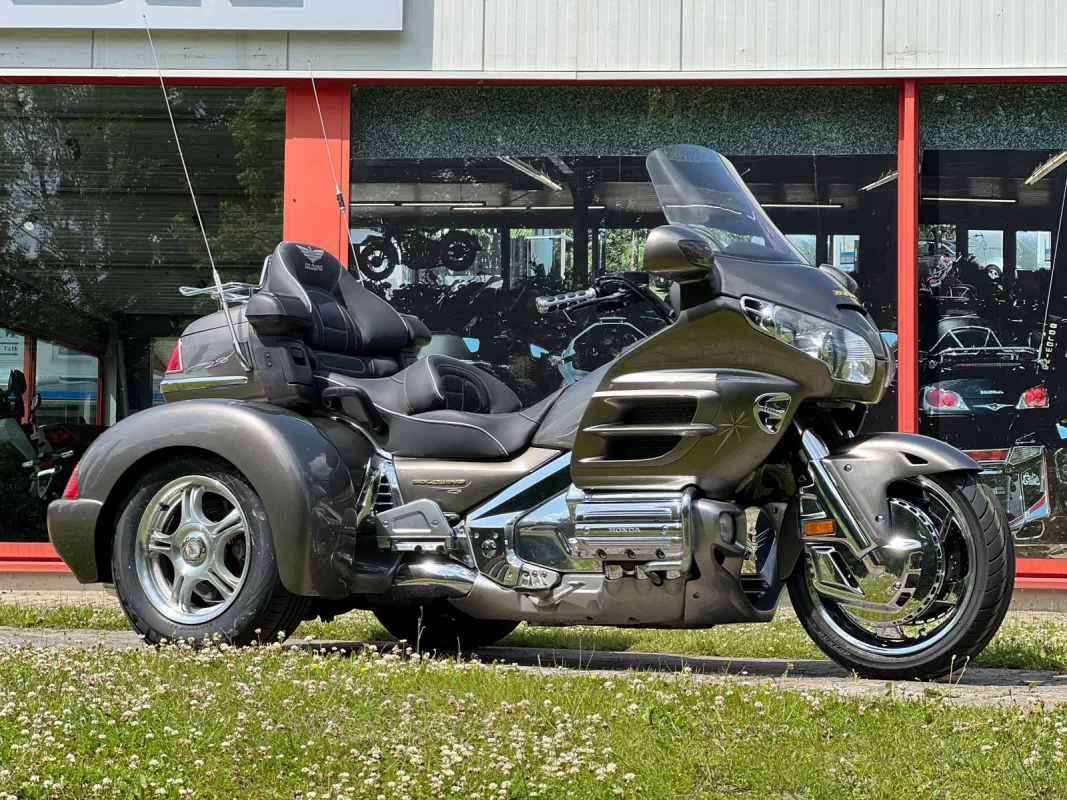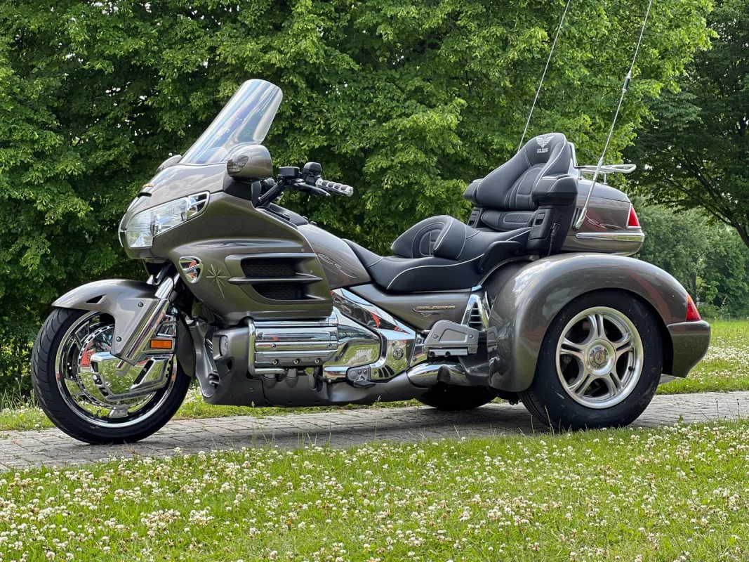 GL 1800 Trike in Titanium. Sehr schön veredelt mit Rotor Covers, komplettes Motor und Rahmen Chrom Paket, Fog Lights, Pig Nose Covers, Beifahrertrittschutz, Chrom Streifen Topcase, Gepäckträger, CB Antenne, 2 tone Sitzbank and some more..