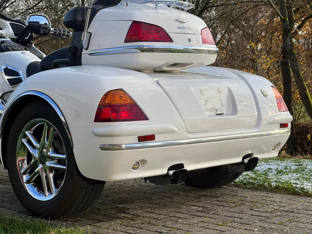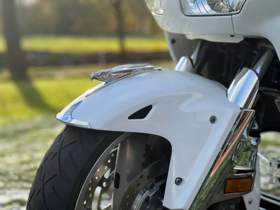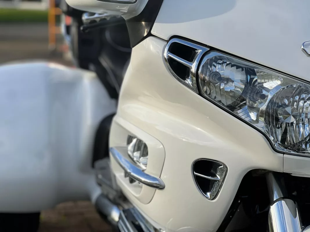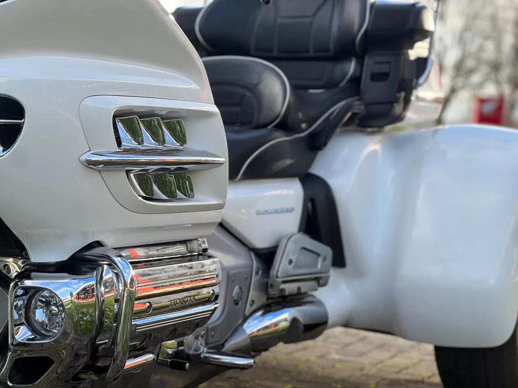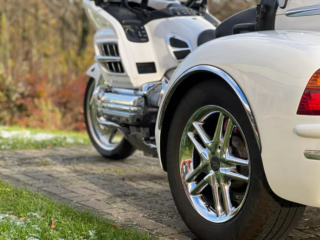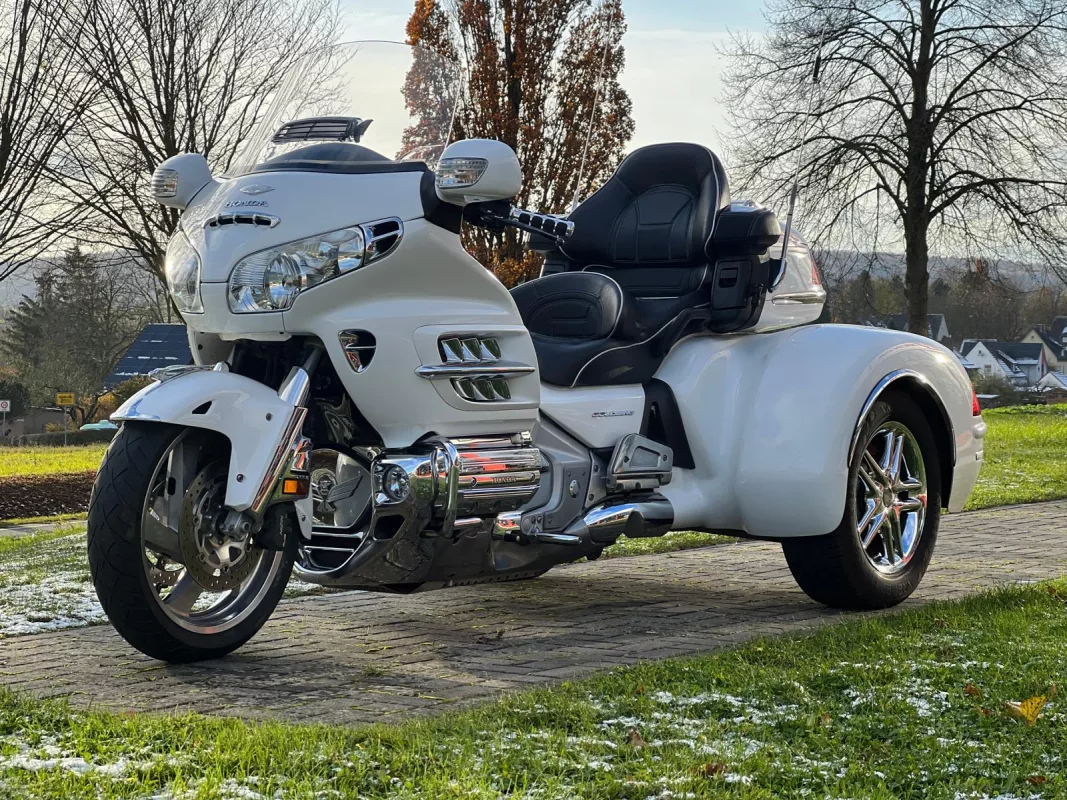 Wunderschönes GL 1800 Cobra Trike mit Einzelradaufhängung und Performance Bremsanlage in Artic White. Klasse veredelt mit Chrom Bugspoiler Fog Lights, Motor Chrom Paket, Front Fender Eagle, Pig Nose Covers, Shark Grills, weiße Blinker, Shark Grill Fairing, 2 tone Sitzbank, Gepäckträger, Chrome Wheels, 2 tone Sitzbank, Dashtop in Fahrzeugfarbe, Iso Grips and some more...