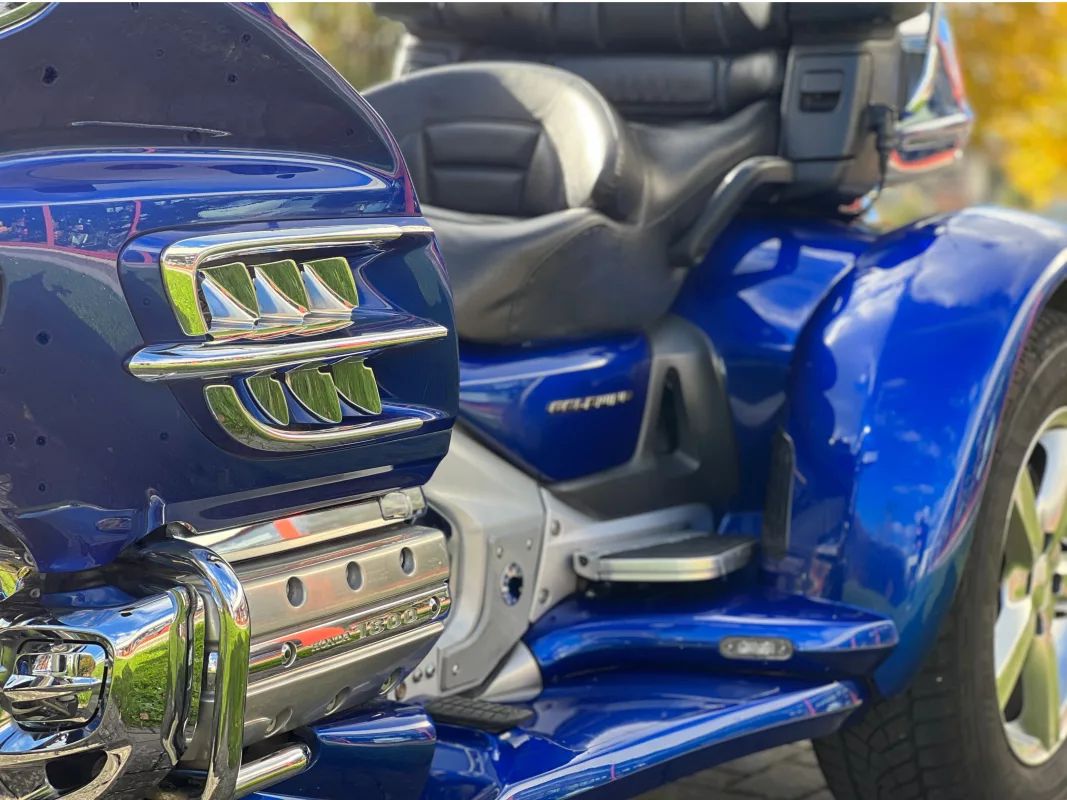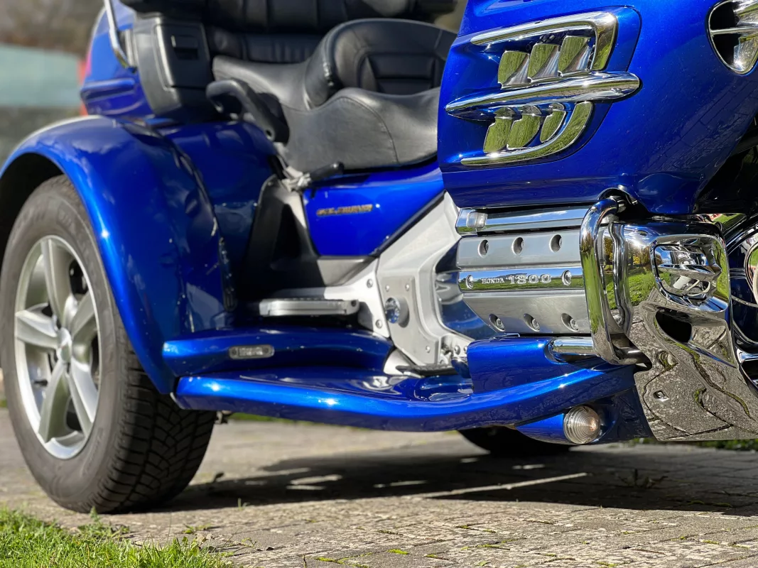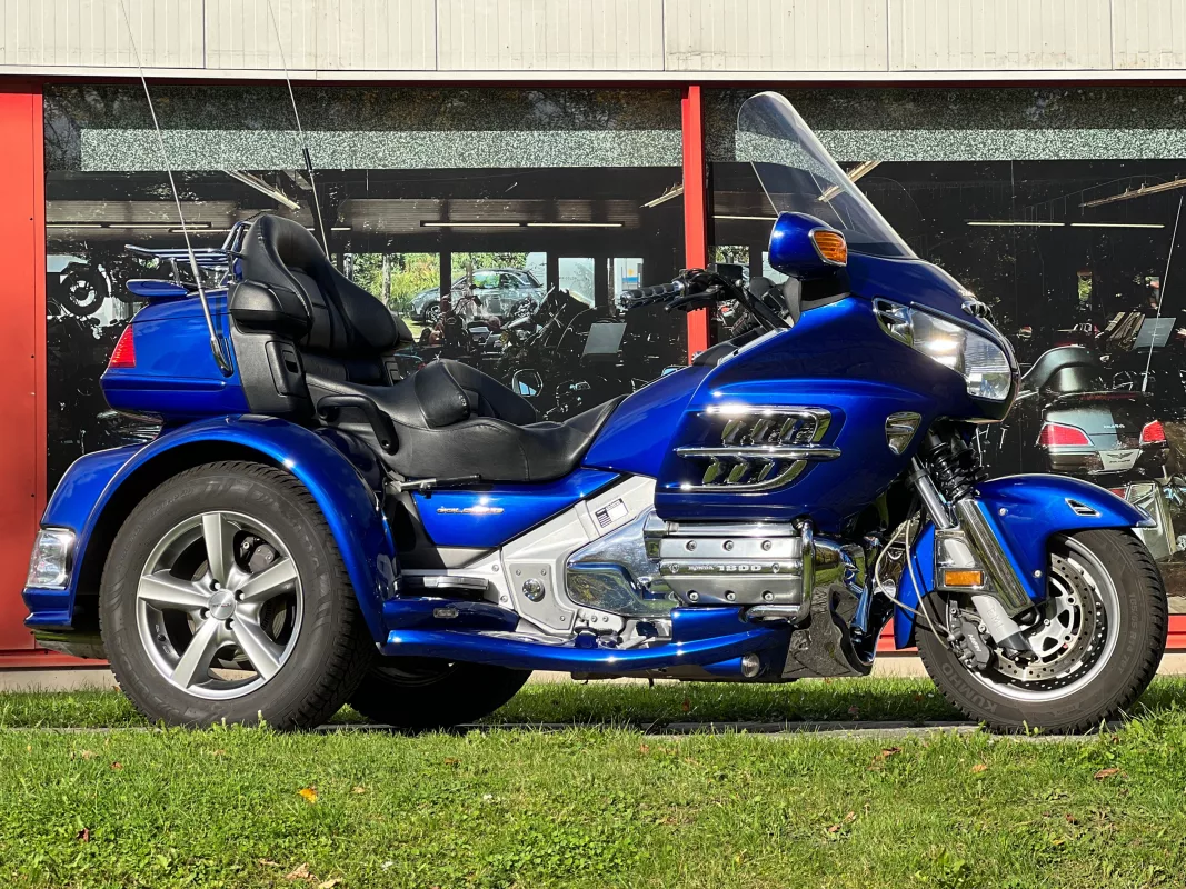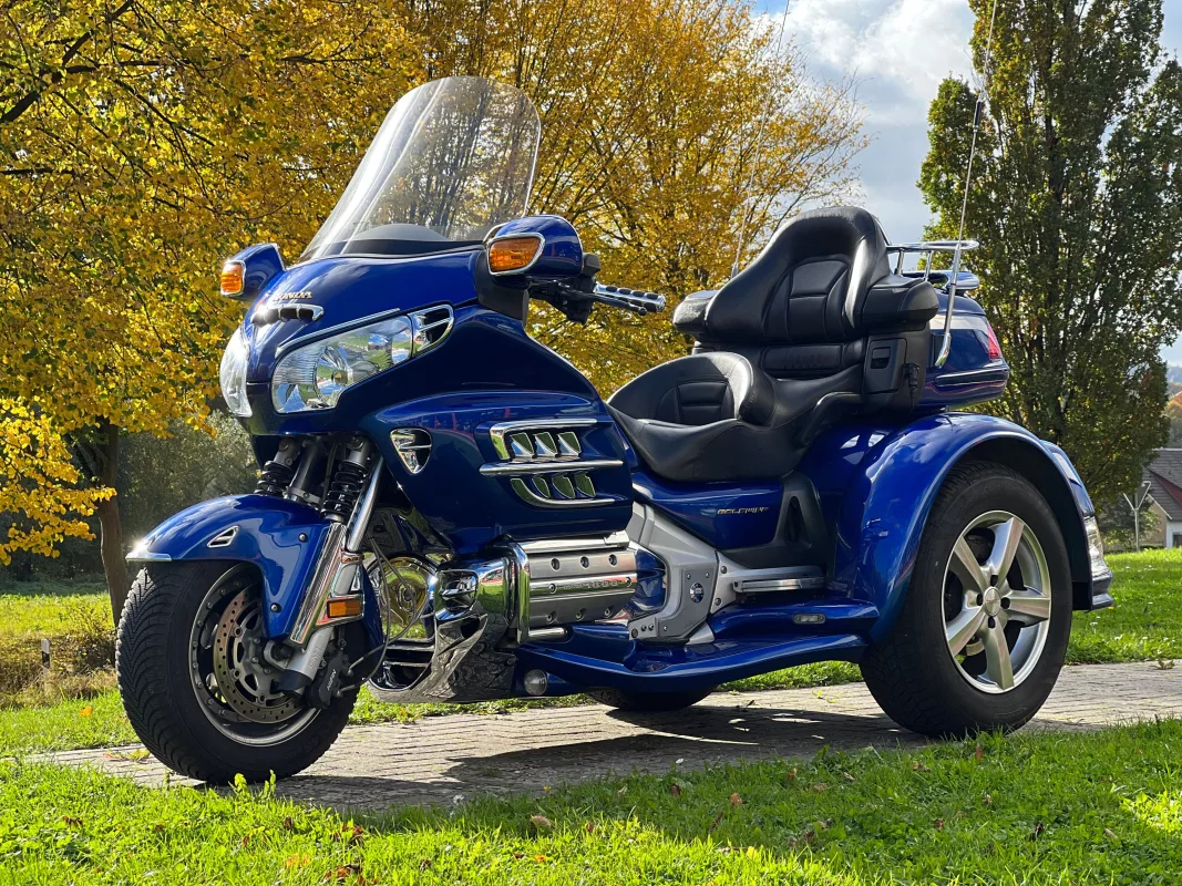 Sehr schönes GL 1800 Trike in Pearl Apollo Blue. Mit Shark Grill Fairing, Eye Brows, Spiegel Chromrahmen, Kühlerchromrahmen, verchromter Bugspoiler, TC Spoiler, Gepäckträger, CB Antenne, Iso Grips, Chrom Paket Innenverkleidung and some more...