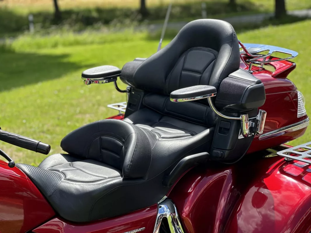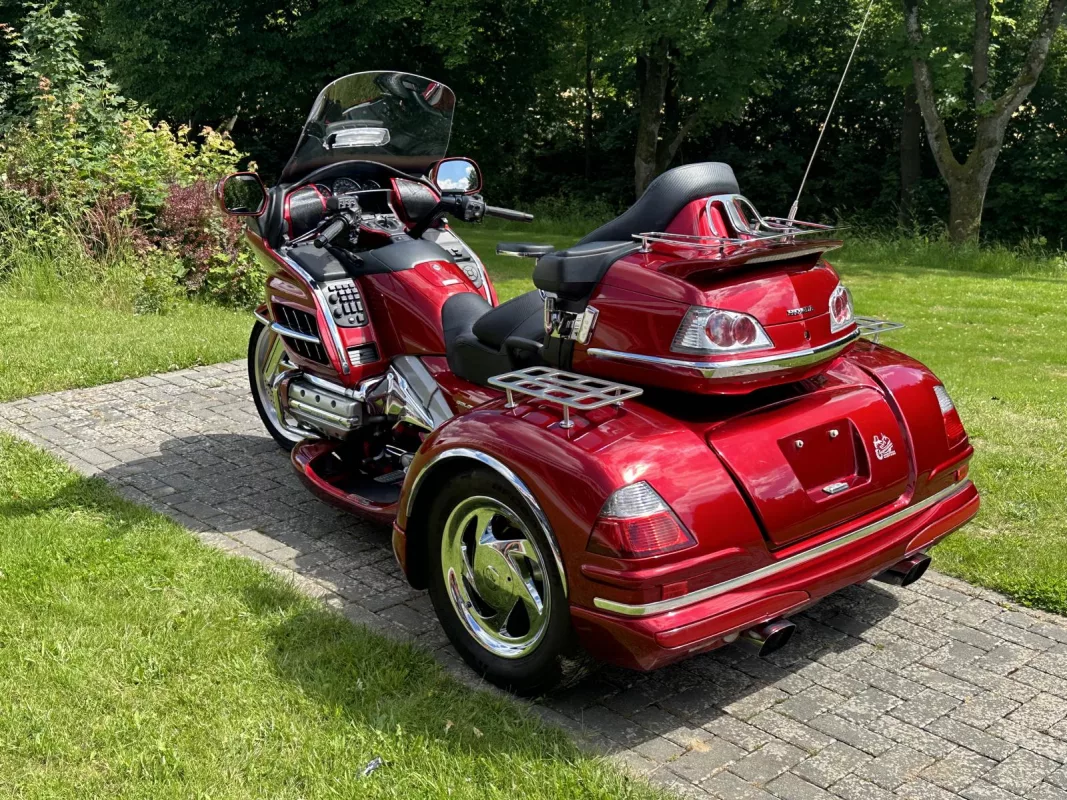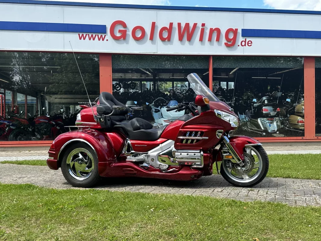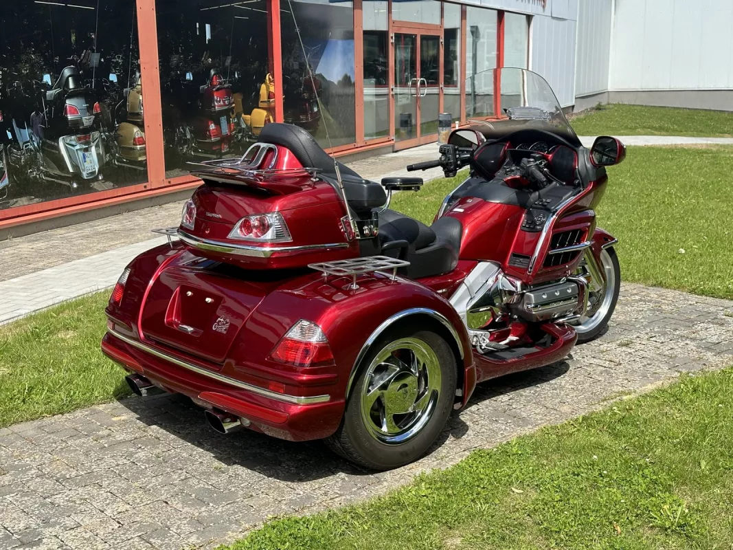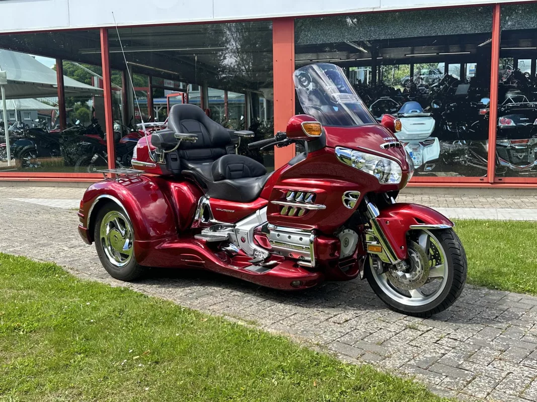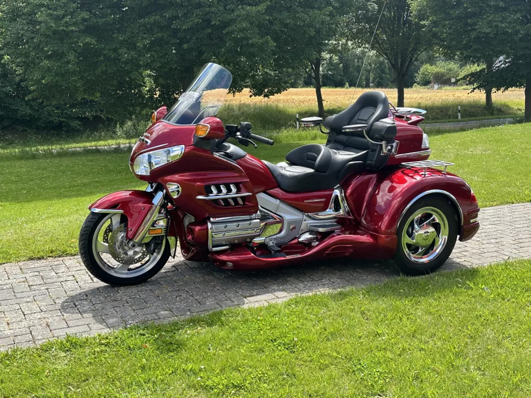 GL 1800 Cobra Trike in Candy Red. Aus 1. Hand, von uns als Neufahrzeug zum Trike umgebaut ! Klasse veredelt mit Kotflügelverlängerung, Pig Nose Covers, Shark Grills, Eye Brows, Spiegelchromrahmen, Shark Grill Fairing, alle 3 Gepäckträger, TC Chromstreifen, Beifahrertrittschutz, Armlehnen, CSC Lightbar unter dem Kofferraum, Dashtop in Fahrzeugfarbe and some more...